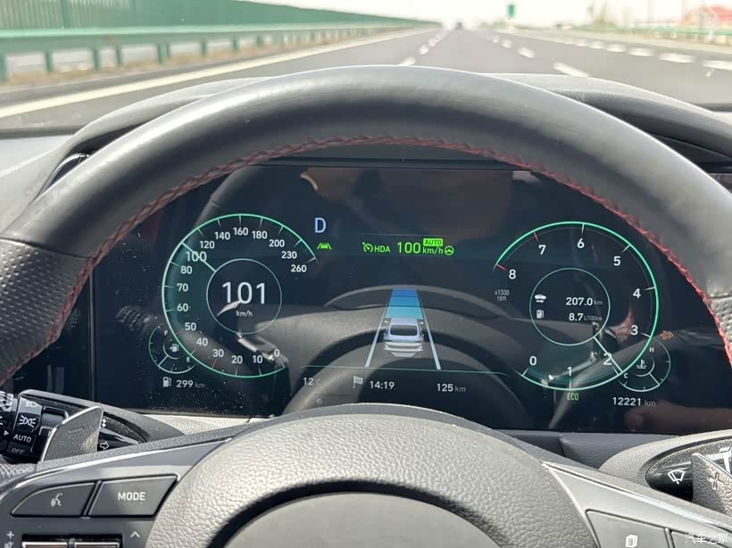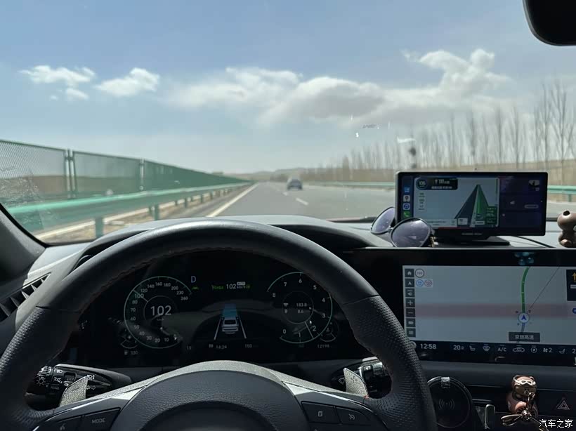 在京新高速上,车辆非常的稀少,果断开启了110KM/h的HDA自适应巡航,同时开启LKA和LKA车道居中,这样就可体验到了类似于坐高铁的感觉,索纳塔带着我前行,我只需要看好前面的路况即可~双手是可以解放出来的,比方说喝水,手机冲个电,完全不成问题。