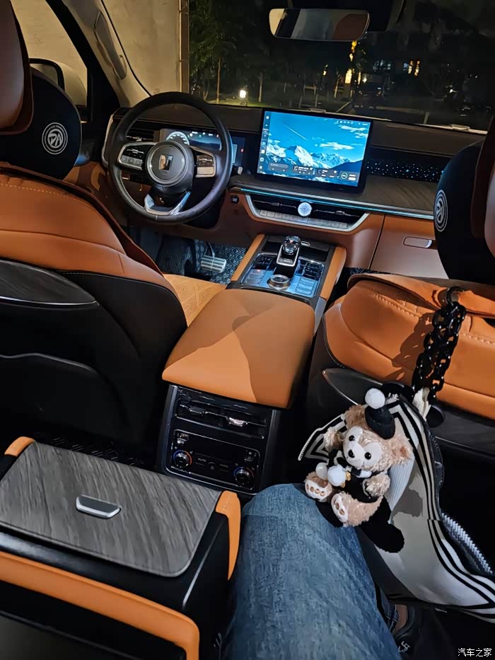 我爱人也买了很多车上的小饰物,比如这个纸巾袋,我觉得也很好看,天还没亮,出发之前坐在后排感受一下,这是我第一次坐后排,真的挺高的,视野也很好