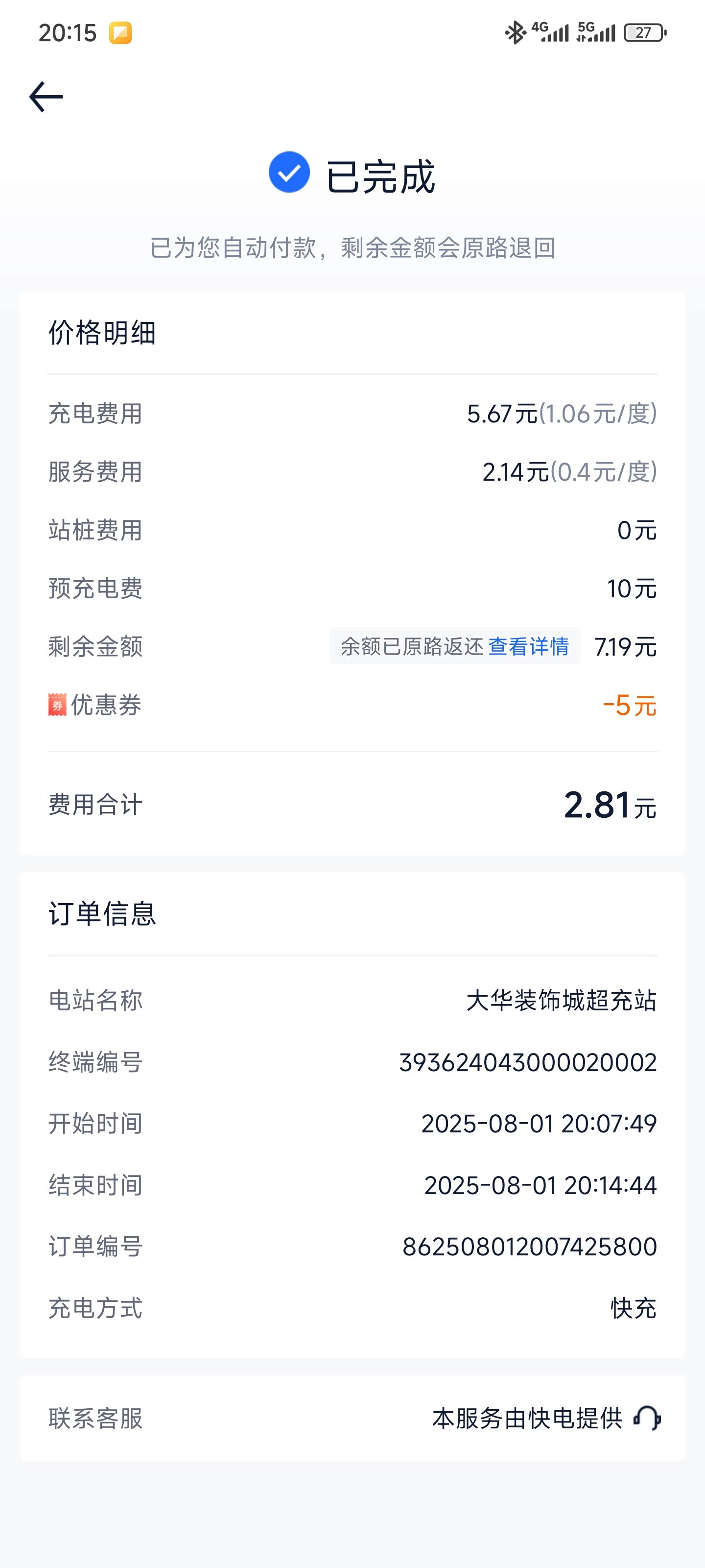 那天突然发现有一个汽车之家给的满六减五的充电券,不知道怎么来的,寻思乘着有空去充一下,结果记错了日期,只能是在电价贵的时候去,哎,少充好几度电,最后原本停止充电是在6块多一点结束充电的,结果结算完都七块钱了,于是就花了两块多。这个地方的充电桩可以显示当前车辆充电的百分比,非常不错。