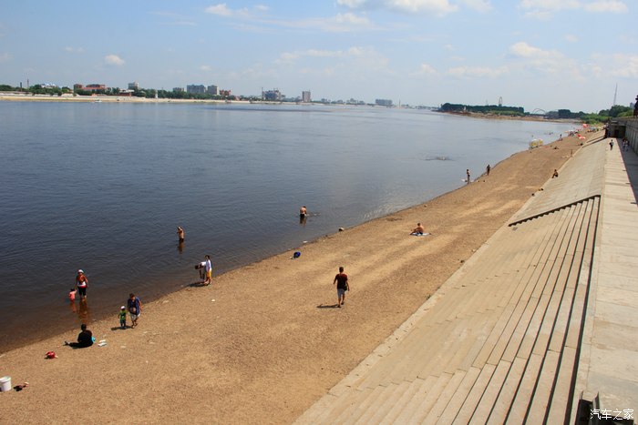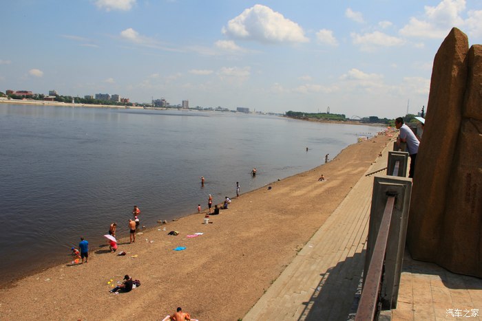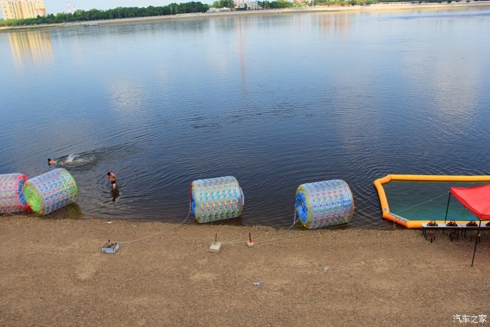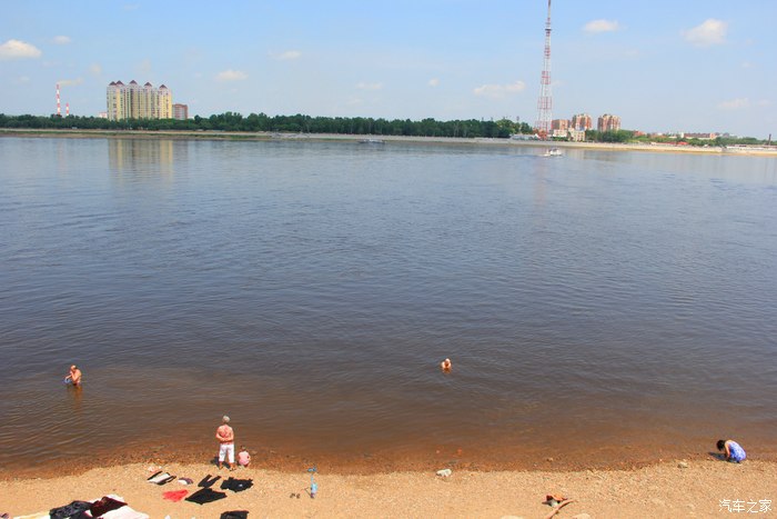 对岸的游乐设施及江边游泳、晒日光浴的人们。