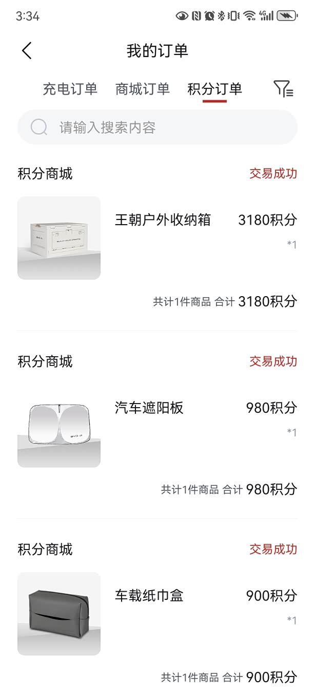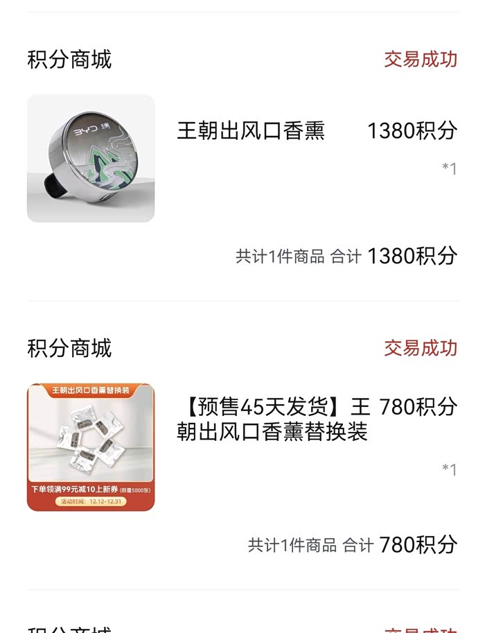 再说说王朝商城,买了纸巾盒、遮阳板、户外收纳箱、小马扎、头枕、腰靠、出风口香薰和香薰替换装。刚买唐前三个月都不知道APP里还有商城还卖商品,发现以后买起来一发不可收拾。整体商品的质量还是很不错的,毕竟价格放在那,但是官方商品,用着很安心。费用方面积分折合20:1,算下来价格也可以接受,总价:45+49+159+68+68+69+79+39+69=645元,车子平时能用的到的东西基本上都囊括了。最让人满意的是户外收纳箱和出风口香薰,收纳箱不多说了,三种打开方式可以让使用中往外拿东西很方便,而且在户外可以当一个小桌子使用,非常全能。而出风口香薰,非常让人经验,香味不是刺鼻的那种香,味道闻着很舒适,而且香味真的很持久。此前有车友吐槽连一周都用不了就没味道了,我第一片香薰安装到车内是1月4日,截止到写帖子这会儿2月14日还没换,空调打开暖风吹出来的味道依然很香。