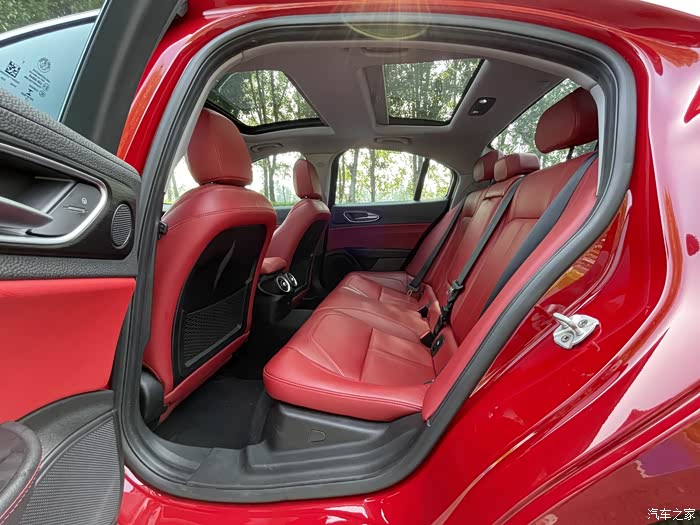 红色外观搭配红色真皮内饰,在左侧方向盘点火 运动座椅 加上座椅头枕的阿尔法罗密欧刺绣徽标,处处都体现了法拉利血统,这样的内饰坐进去就会有满满的操控激情和战斗欲望 空间上不是这台车的优势 而且买这个车肯定也不是为了空间 基本都是为了追求纯粹的操控驾驶感受 肯定要有所牺牲