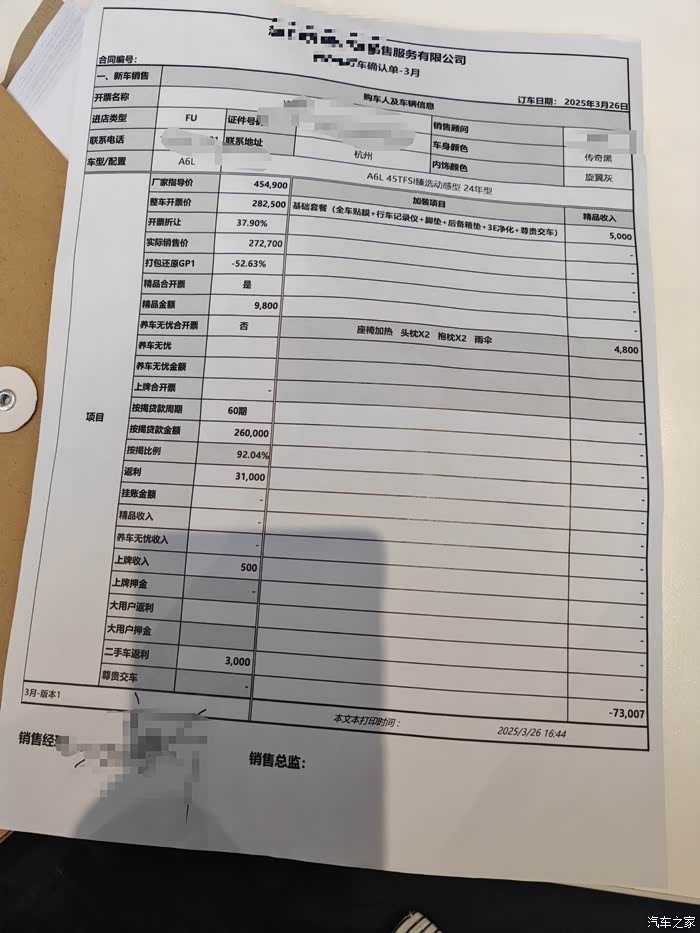 各位车友,给老妈喜提奥迪a6l两驱动感甄选,330800(含保险+购置税➕9800的两年延保及9次常规保养,不含一年年利息➕违约金共计1.8万,杭州补贴1.6万。)