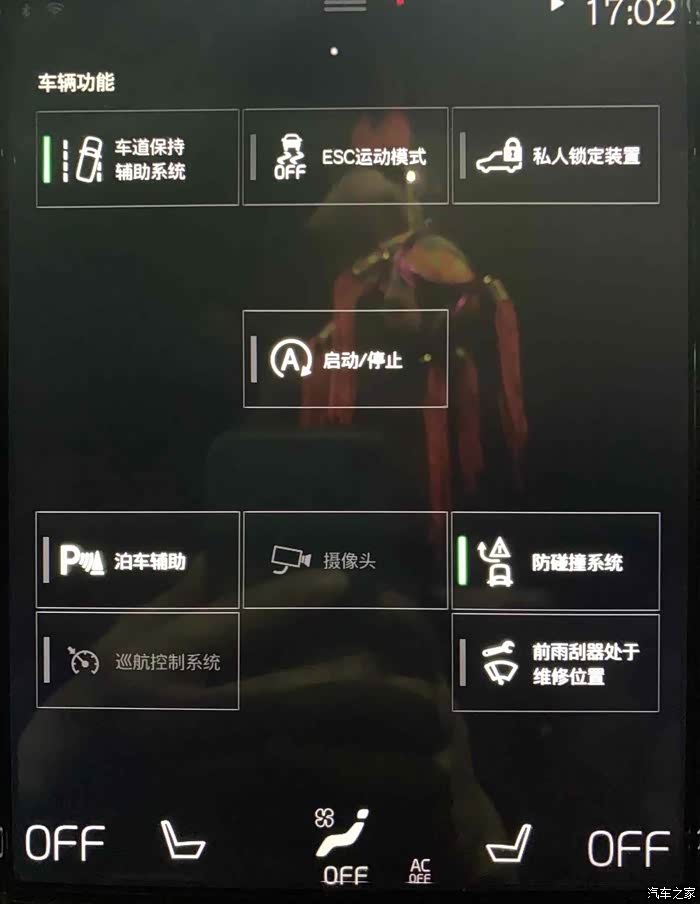 2、中控屏负一屏,就是设置自动启停功能的那个页面,长按图标可以重新排列图标位置。我是把最常用的关自动启停的图标单独放在了最中央。