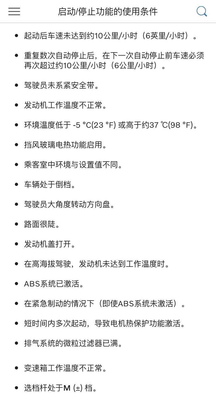 7、XC40有两个电瓶,一个70Ah的主电瓶一个10Ah的辅助电瓶,辅助电瓶主要用于点火瞬间单独给一些电器供电,以避免受主电瓶在点火时电压过低的影响,它和大电池之间用一个二极管做隔离,电流不会反向给大电池供电的设备使用。辅助电瓶没电后,也会停用自动启停功能。启用自动启停功能需要满足20个条件,见下图,任意一个条件不满足即会停用自动启停功能。特别是夏天开空调后,大多数情况是制冷没有达到设定的温度,所以自动启停功能不会激活。