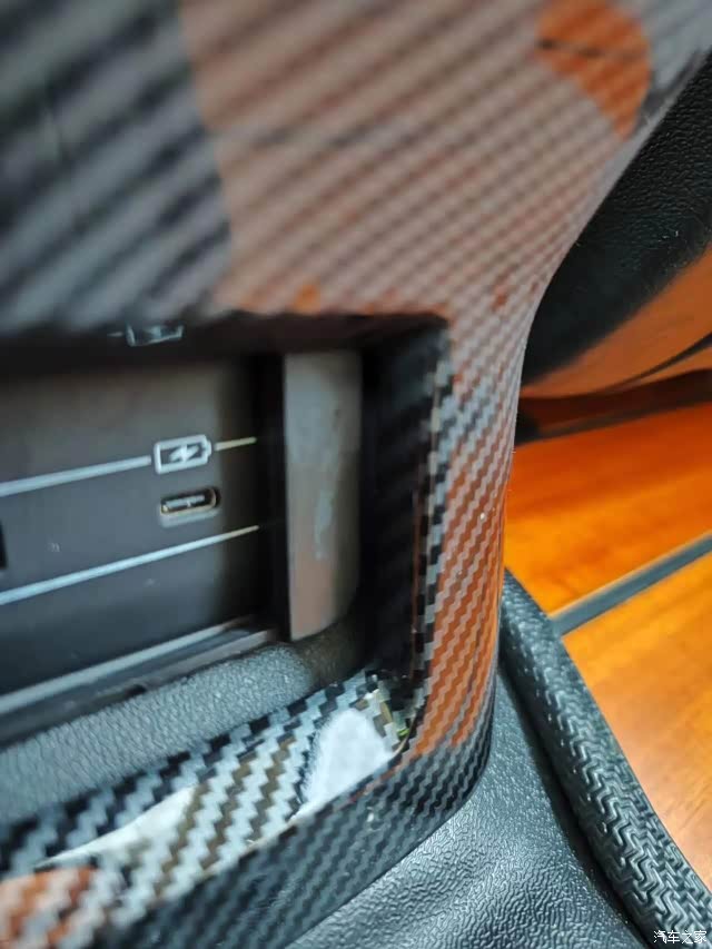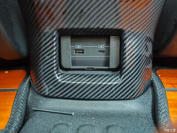 来到中央扶手箱后排,有两个接口,左边的是一个普通的USB接口(最大输出电流2.1A,电压5V),右边则配备了一个神奇的type-c接口。