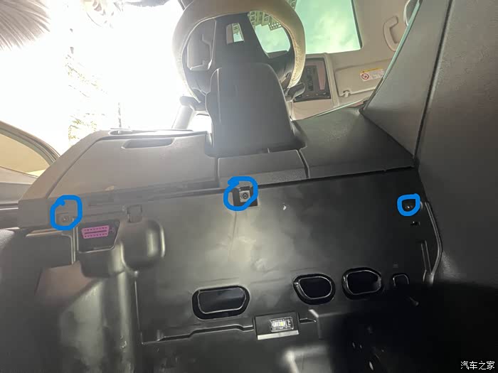 然后就可以拆方向盘下控制单元护板了,上方3颗螺丝,最深处2颗螺丝,螺丝位置如下: