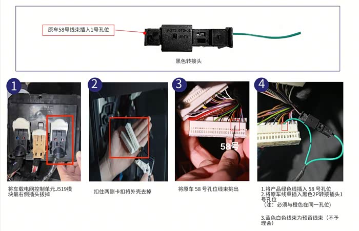 这块就不多赘述了,主要是力气活,线束比较短,不太好伸手。共计2个模块连接线束需要转接,j519模块在三角板的里面靠外第一个,将58号线束(黑红色)用卡针捅出插入绿色线转接头中,再拿产品带的绿色线束插入原车模块中。针脚有也有卡扣,需要先在中间这排洞里戳一下抵出卡扣,再从底部捅出。对插时也要注意,针脚不是规则的矩形有一边突出,对接口也有对应的一边,可以仔细观察一下。