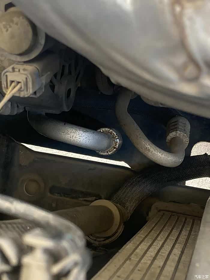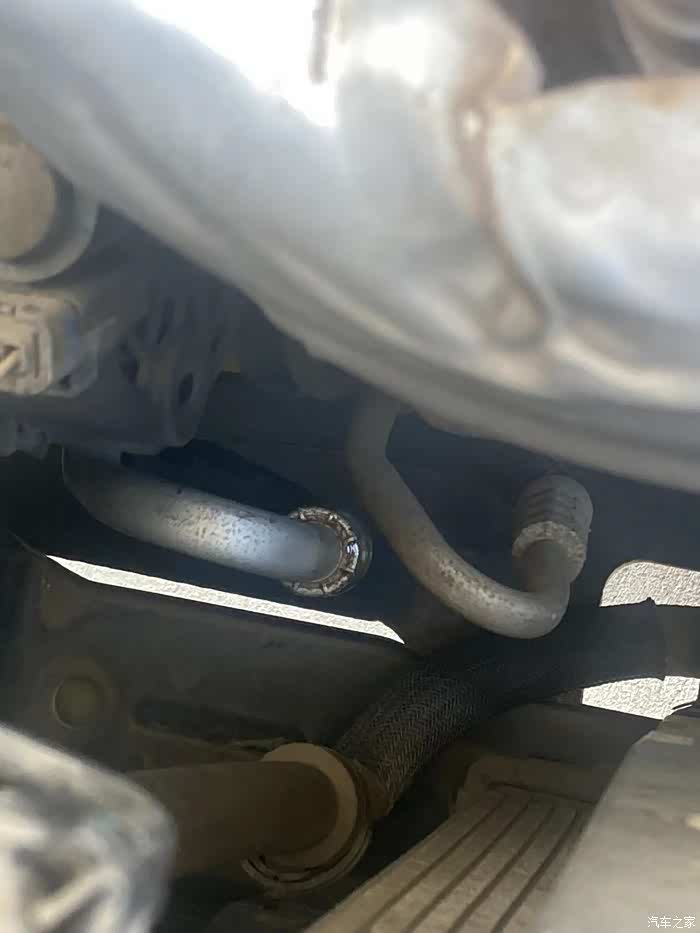 空调低压管,汽车空调开启后,温度比较低,冰冰凉,上面是冷凝水,没问题的