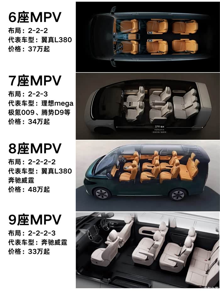 小编整理了以下目前市面含定制,3-9座mpv,比如翼真可定制3座,威霆有9座上市版。但目前主流的还是6-8座,舒适度更高,其中7座的占数也很多。不同的座椅布局有不同的应用场景。当然,作为出行率高的车型,安全系数也很重要。翼真L380顶配配有11个安全气囊。威霆9个安全气囊,MEGA7个安全气囊
