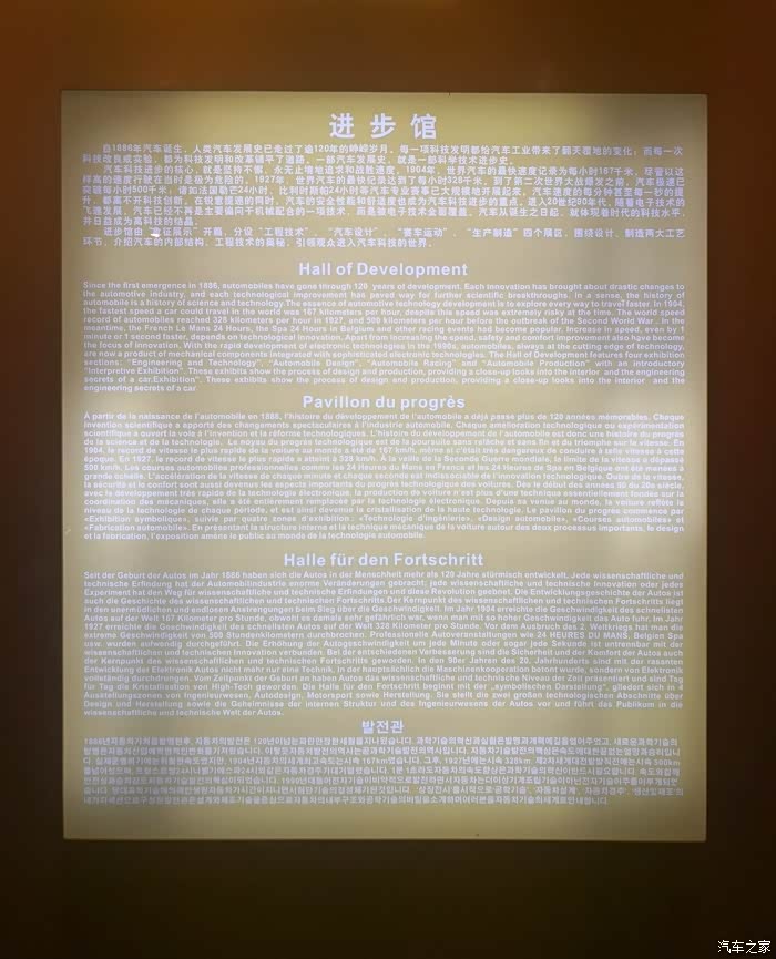 四层为进步馆,主要是展示汽车的内部结构、工程技术和设计制造方面的知识和场景。