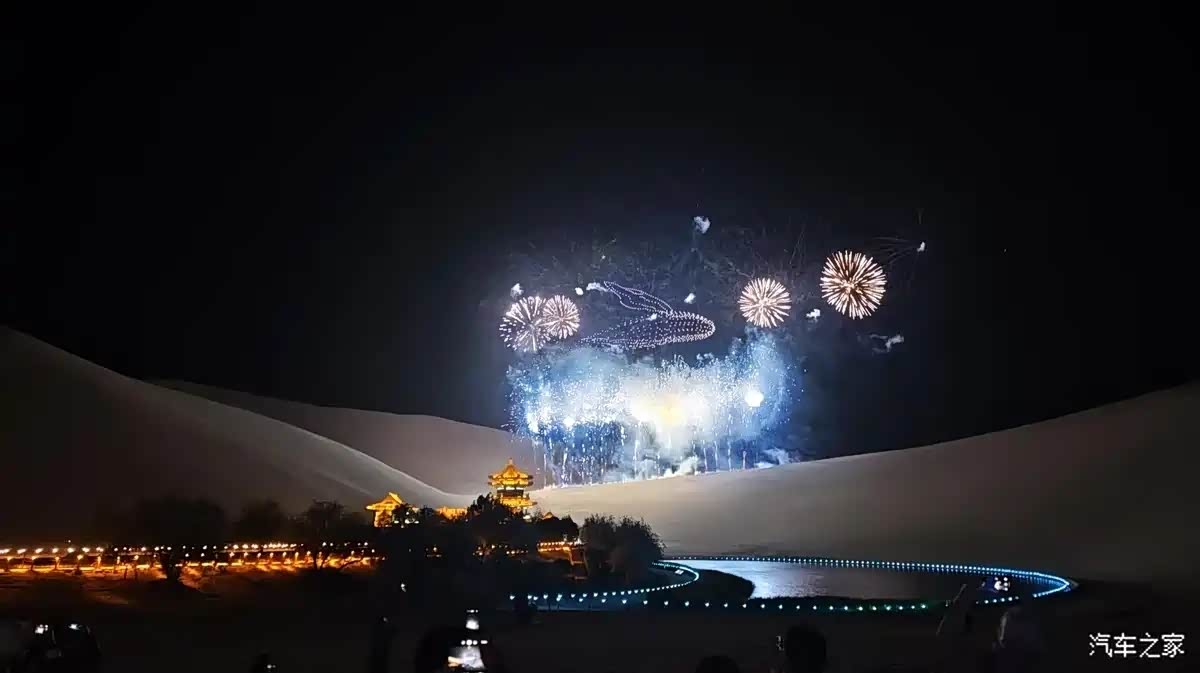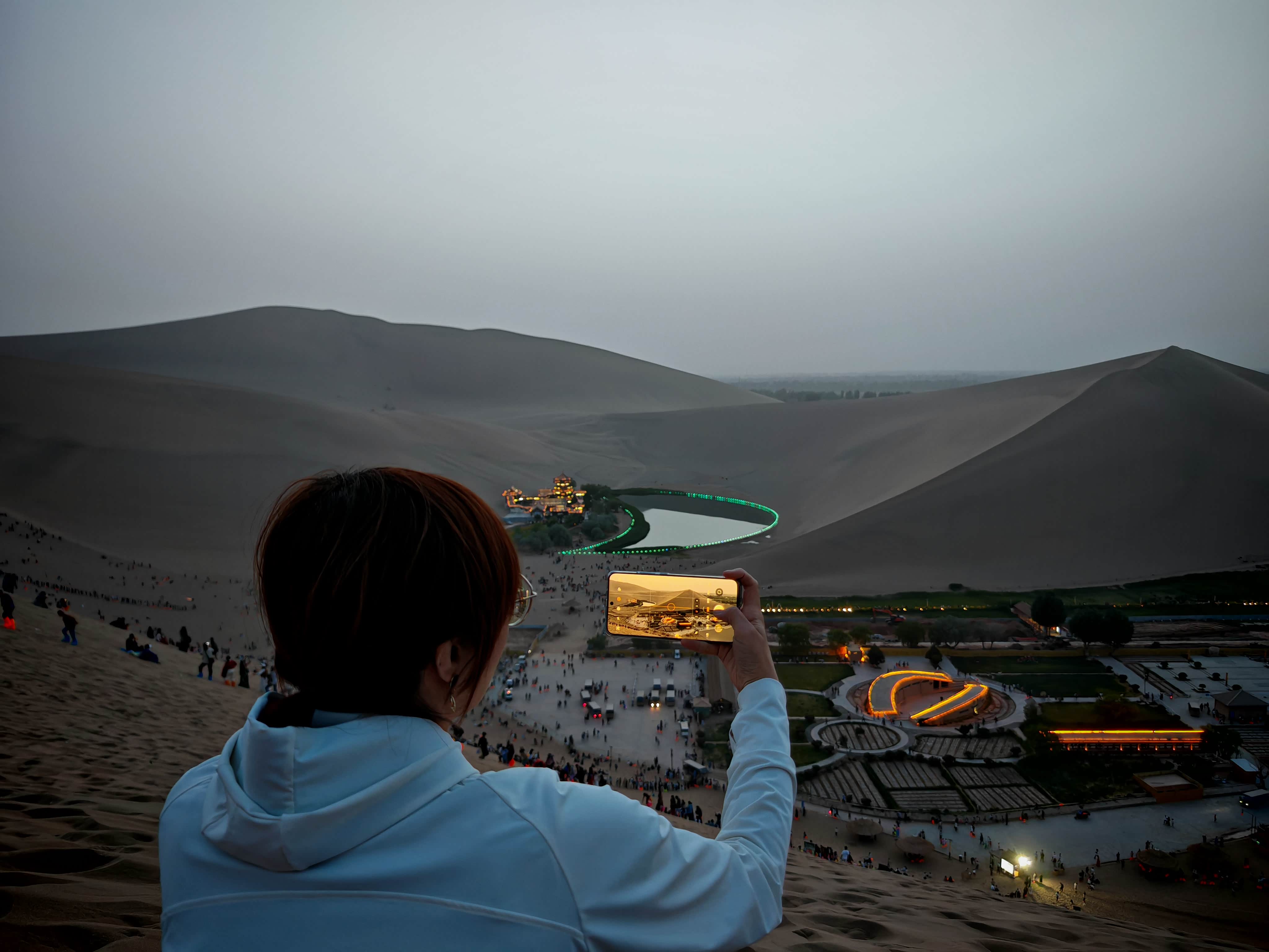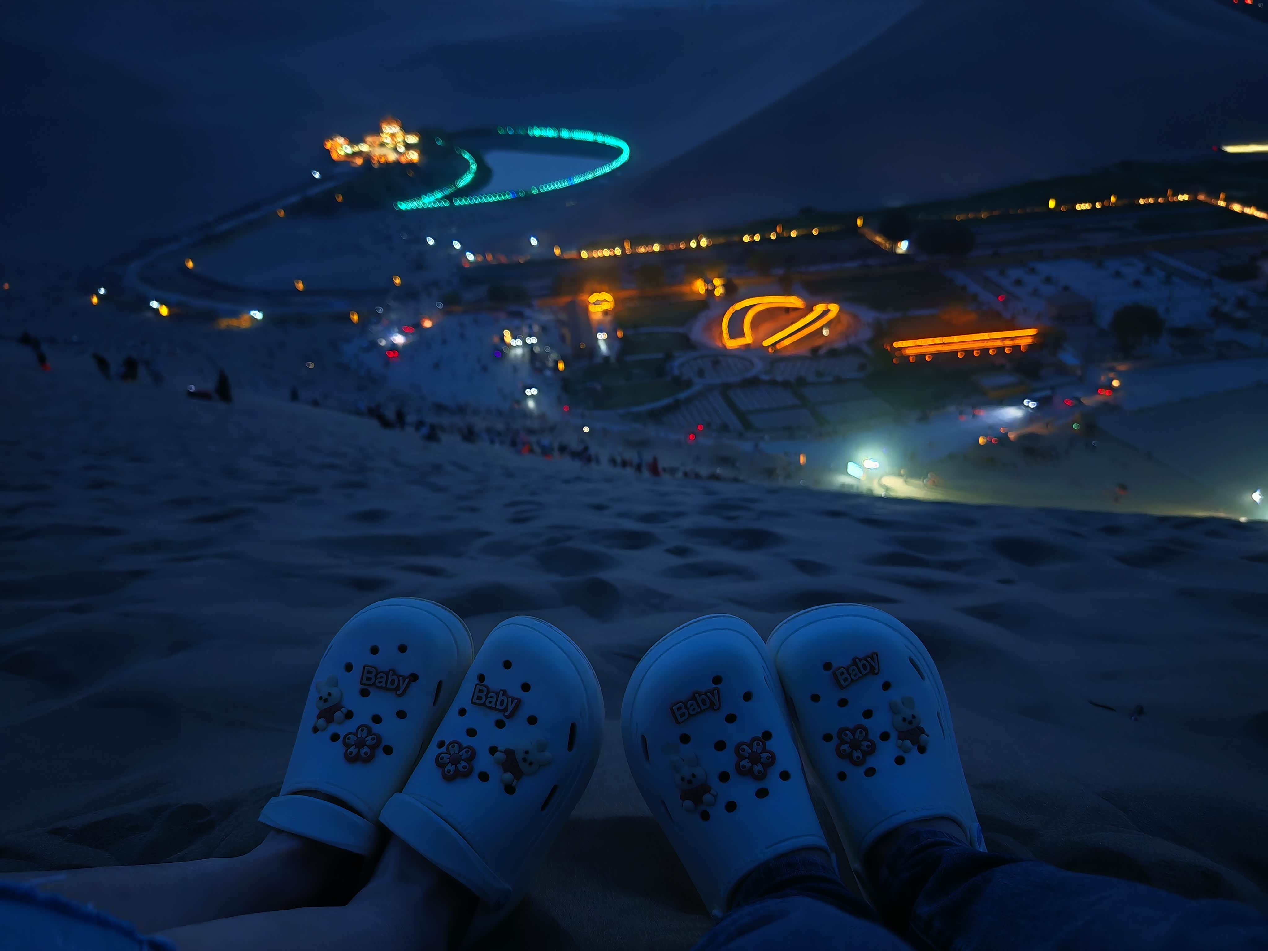 傍晚,走进鸣沙山月牙泉。当瑞虎7 PLUS停在景区停车场,我迫不及待地踏入这片沙漠奇观。鸣沙山的沙粒在霓虹灯下泛着金色的光,月牙泉如翡翠般镶嵌在沙漠之中。