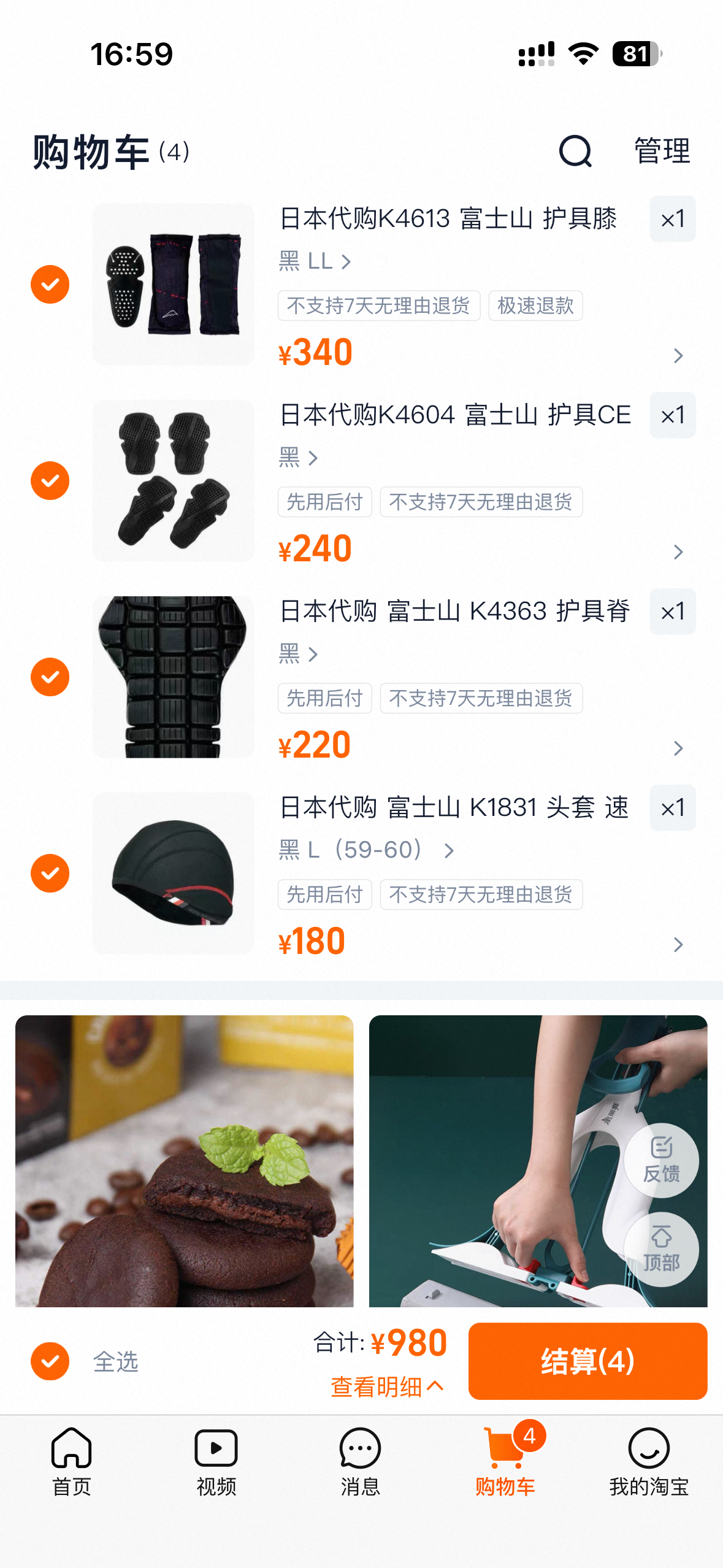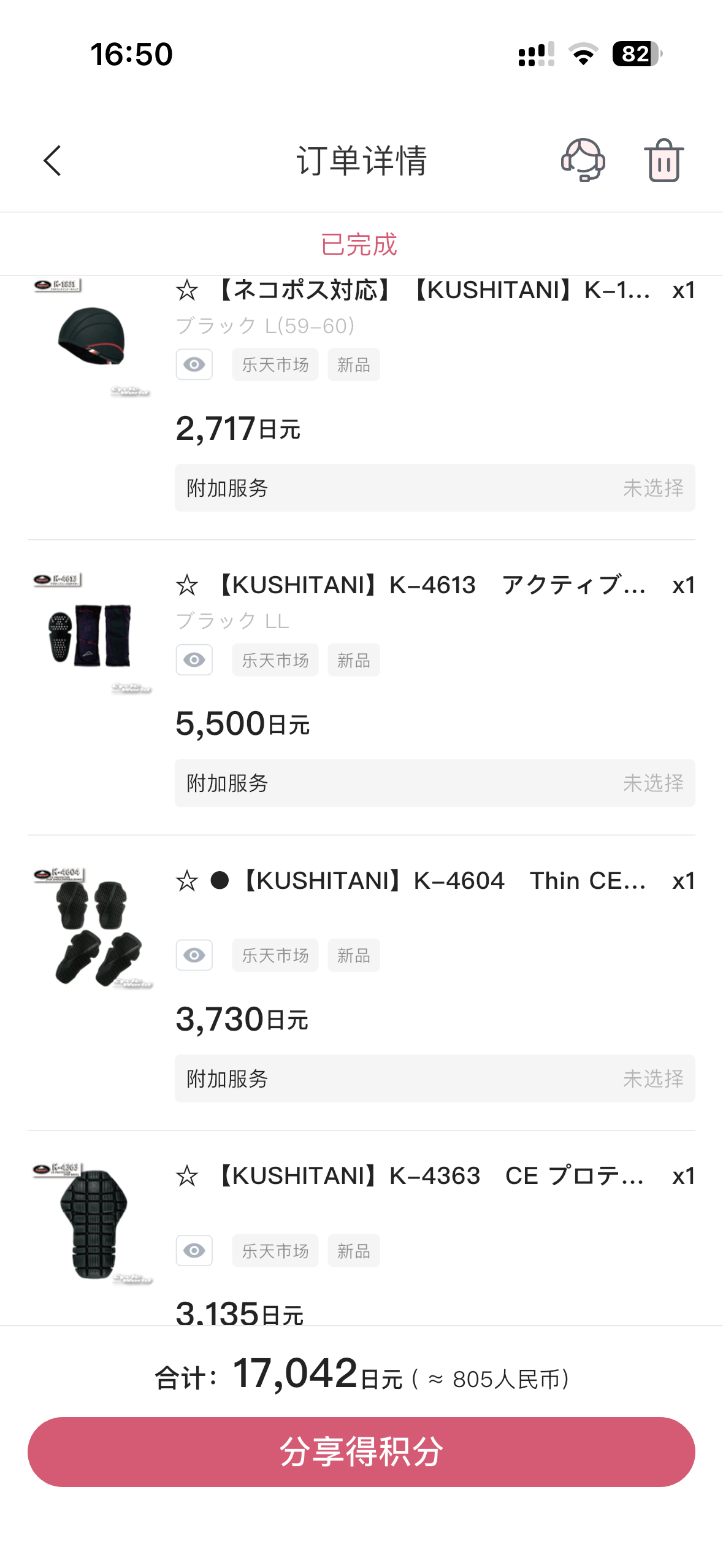 我自己从购物平台查看一下价格,四件价格15082日元,扣除手续费800日元,再加上平台优惠券1000日元,实际付款价格是14882日元(折合人民币703元)。