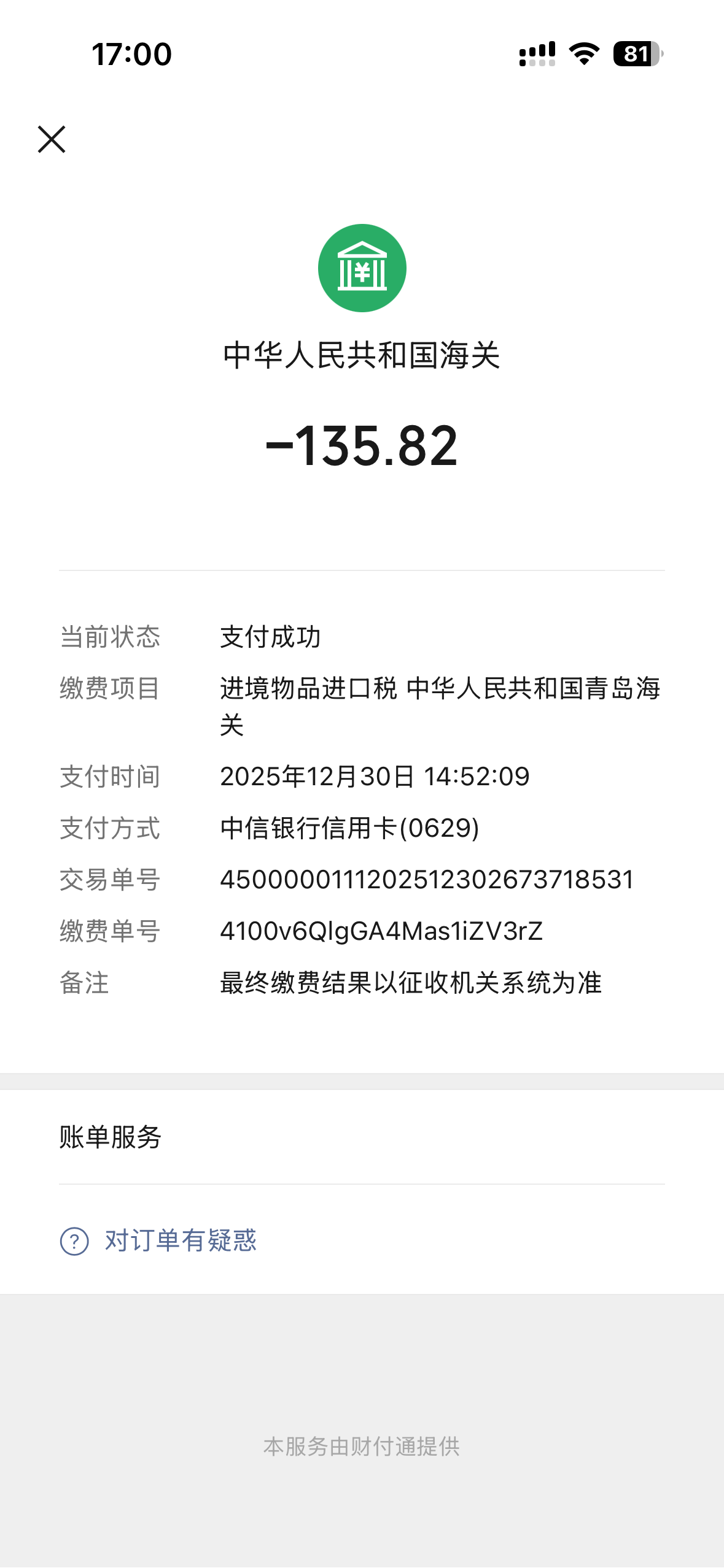 在这个环节,你会收到短信,提示你通过“掌上海关”等多个渠道缴纳海关关税。我下载注册海关关税小程序,缴纳关税135.82元后,平台物流会显示邮件已放行。