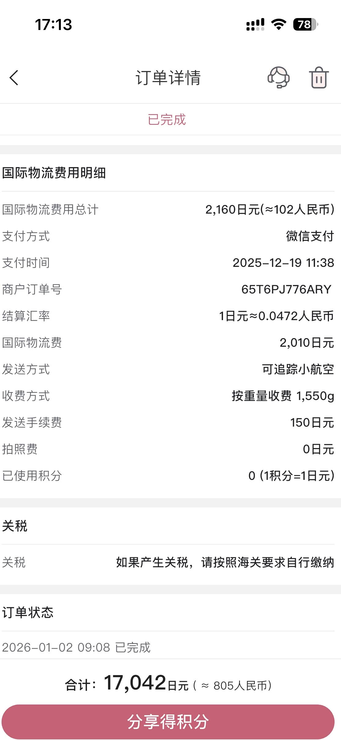 这个日本某电商购物平台,购物支付是直接可以用微信付款的,这样对比国内代购价格,就加上运费及关税,大体匡算价格感觉还行,就在2025.12.13下单,直接微信支付703元。