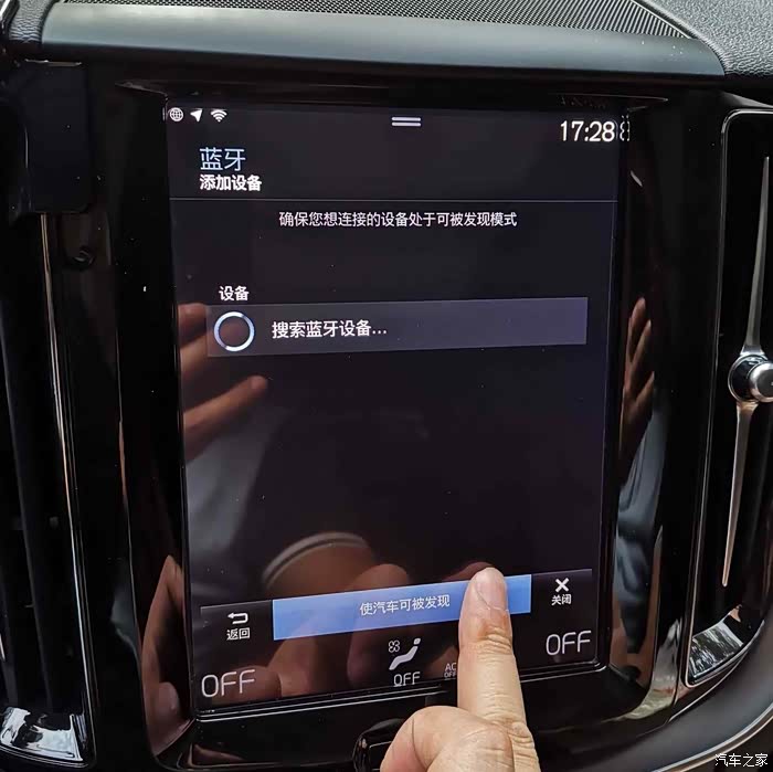 蓝牙要配对,首先要被连接对象发现,点击“使汽车可被发现”