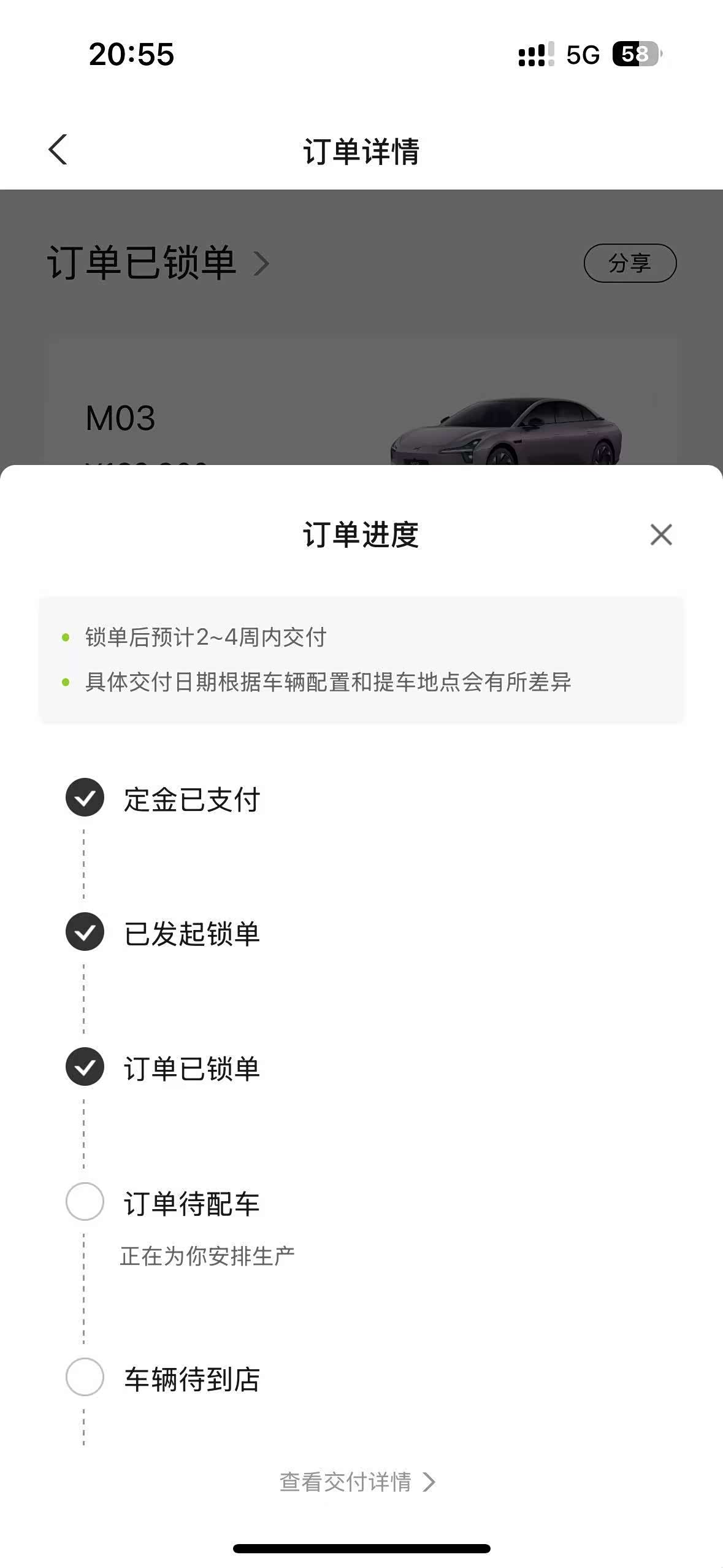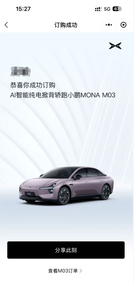 在解决完置换的事情后,我就直接在APP上锁单了,选的是600公里续航的满血版双紫配置。