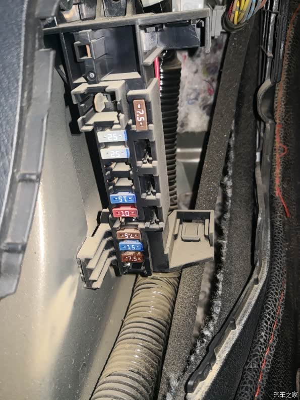 各位车友大家好,我是一四款的车,昨天不知道怎么搞的,中控台点烟器突然不通电了,导致行车记录仪没电。然后各种找论坛相关资料信息,大致了解一下亲自动手。1.先检查自己的车子是不是点火线圈的保险丝烧了?确定这个是不通电的扶手箱下面这个电源也是不通电打开主驾驶下面这个胶壳,用手轻轻一拧就开了从上往下看,最下面那个1.5安的篮色的盖子(注意我这个是把坏掉的保险丝取出来了,拍的照)被烧断了的,保险丝2.找备用保险丝,打开发动机引擎盖,嗯在机场的右边找到电源盒打开。就这个,上下都有一个卡口用手轻轻一挤就打开了打开以后盖子的上面有四个备用的,保险丝和一个取保险丝的白色卡子取出蓝色的1.5安的保险丝对比一下,左...
