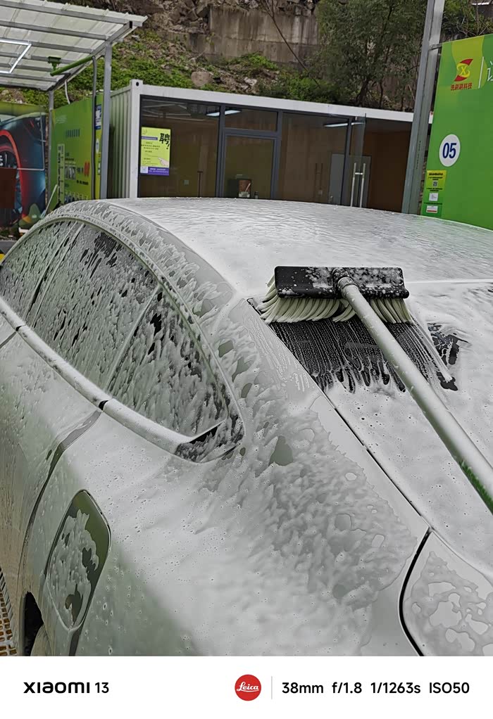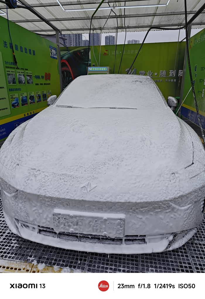 2.第二步:如果是很久没有洗车,需要先喷一层泡沫,等待5分钟,让泡沫软化车上的鸟粪等其他脏东西,避免直接用水冲洗划伤车漆。喷泡沫的过程相当解压