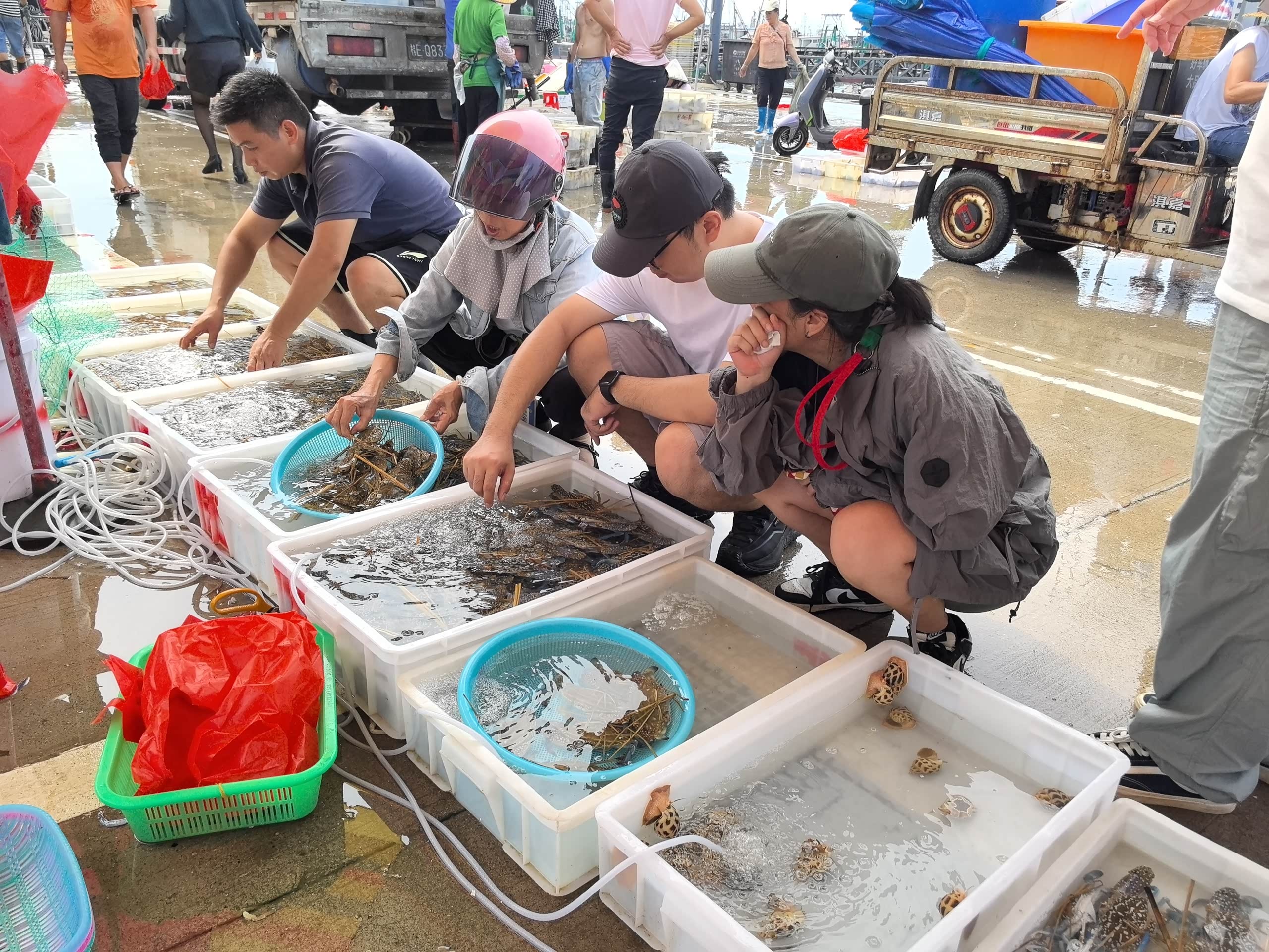 第二天一大早,我们通过小分队中一位车友的关系,找到了他的一位当地朋友带我们去码头买海鲜。这位朋友非常热情,还特意请了她妈妈一同前往,帮我们精心挑选最新鲜的海产品。阿姨真是火眼金睛,一个个帮我们挑肥美的海鲜,买完回到她家后,还帮我们暂时存放在她家隔壁的饭店打氧保鲜,这样的贴心让我们都好感动,非常感谢阿姨的帮助。