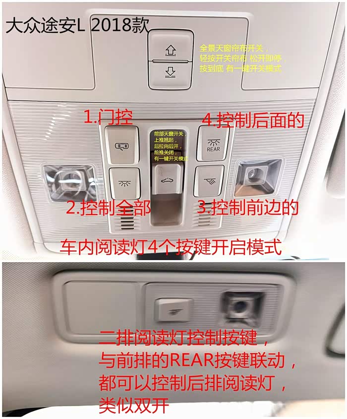 看一下前排阅读灯边上的4个开关,之前拓界版和之后的不一样,但是大同小异,后排开门不亮是前后排的开关怎么按的问题,看是都按下去还是都没按下去,试一下前后排按键的组合方式,一般是把前排的按下去 后排的不按,这样后排就跟前排阅读灯一致了