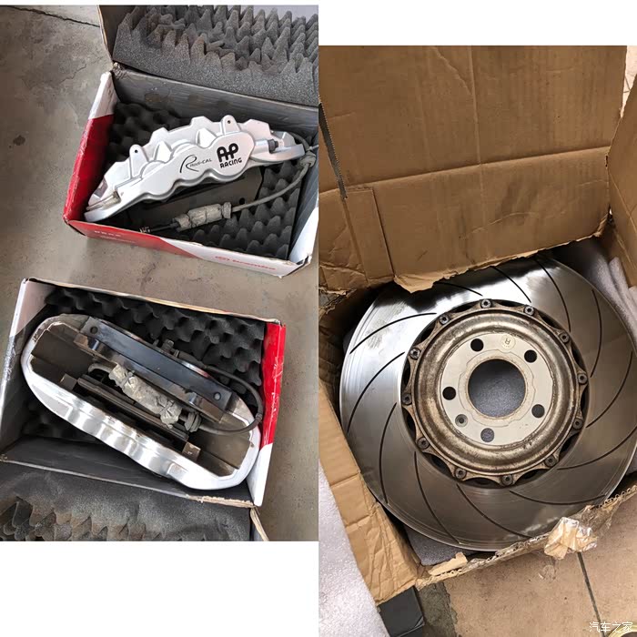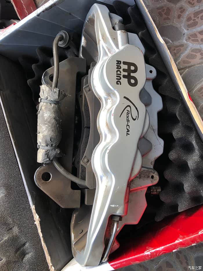 其实买刹车的时候,轮毂还没买,但是命中注定这东西是属于你的时候,你是小白也抓得住。机缘巧合,碰到一哥们的A5还原卖车,一聊之下感到对方非常爽快直率,在完全不会看正版AP的情况下,凭直觉觉得他卖的是真的,于是就收到了这套8520六活塞卡钳刹车盘前轮套装。