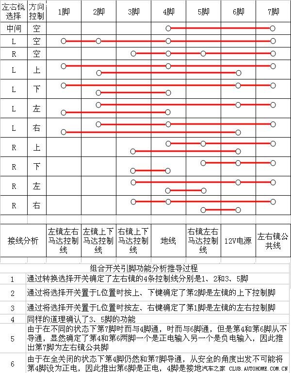 1.确定电路控制方案。出于改装方便的考虑肯定不会采取经车身电脑控制的,完全没有必要,因为原理就如儿时玩的线控车那么简单。最原始的方法就是直接使用4个单独的换向开关分别控制4个电机,但是那样做好象也太土了,不说操作起来不方便,单是4个开关的布置就让我头大了,因此CANCLE。下一个方案是保留2组换向开关而增加一个左右选择开关,这样就减少了一个开关,但是布置上仍然比较麻烦。当然我也知道象两个换向加一个选择的组合开关是最完美的,但是组合开关的引脚测量起来很复杂,而且并不是每一种都能直接控制12V的强电。如果是,这就意味着组合开关必须至少要有7个脚,其中2个输入脚,2个左镜输出脚,2个右镜输出脚,1个左右镜公共输出脚。少于7个脚的组合开关肯定不能直接控制马达,要么加继电器,要么就是进电脑的。因此在购买的时候最好选择刚好7个脚的,而且引脚不能太细。最好带上万用表测量一下导通情况进行确认。