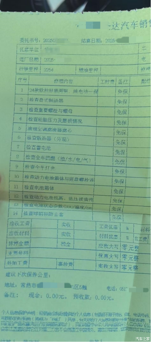 检查表上项目很多,蓄电池、散热器、动力电池箱体等,但都是普通检查半小时就弄好,师傅还给我加了玻璃水(但这边是不防冻的),还给大家问了下冬天的胎压情况,说冬天250左右,夏天240左右正常。