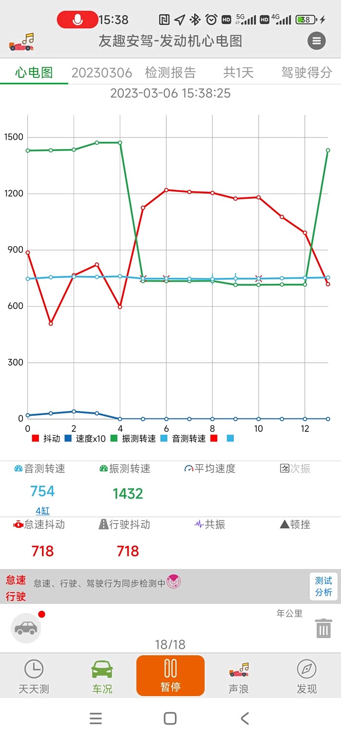 这是快回到家时洗车,怠速时测的数据,700多,一切正常。