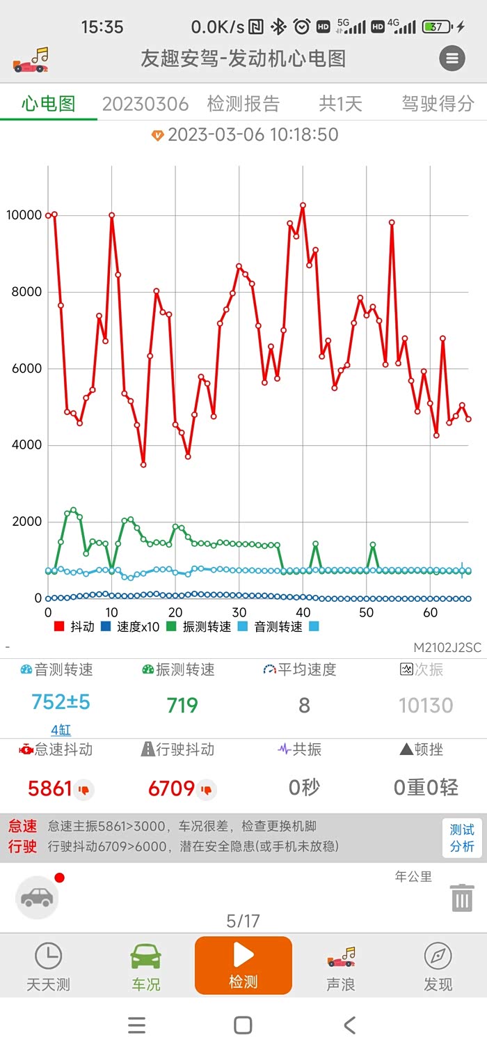 用这软件,在国道上开空调60时速行车测的数据,得到惊掉下巴的数据,抖动5000多,6000多……这车是自带按摩椅吗???
