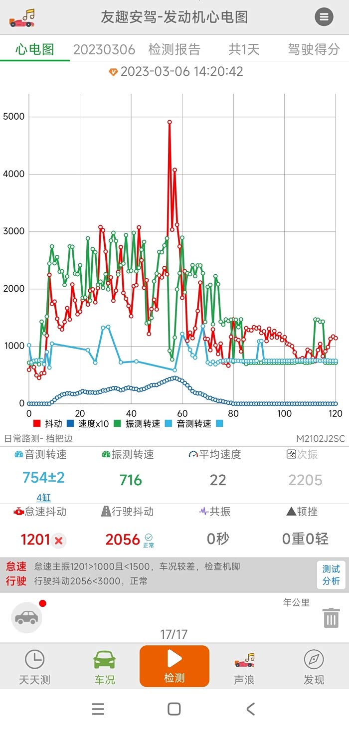 三个小时后,更换完毕。着车一试,天啊(内心非常惊喜),质的改变,车内瞬间安静,开空调挂档也感觉不到振动了,当然感觉比我另一台1.5升自然吸气的车还是大一点点,但已经非常非常满足了。这是用软件行车测的振动数据,从原来的5000多掉回1000多。