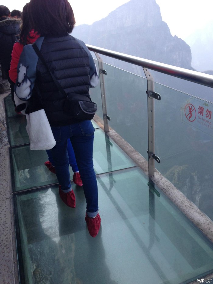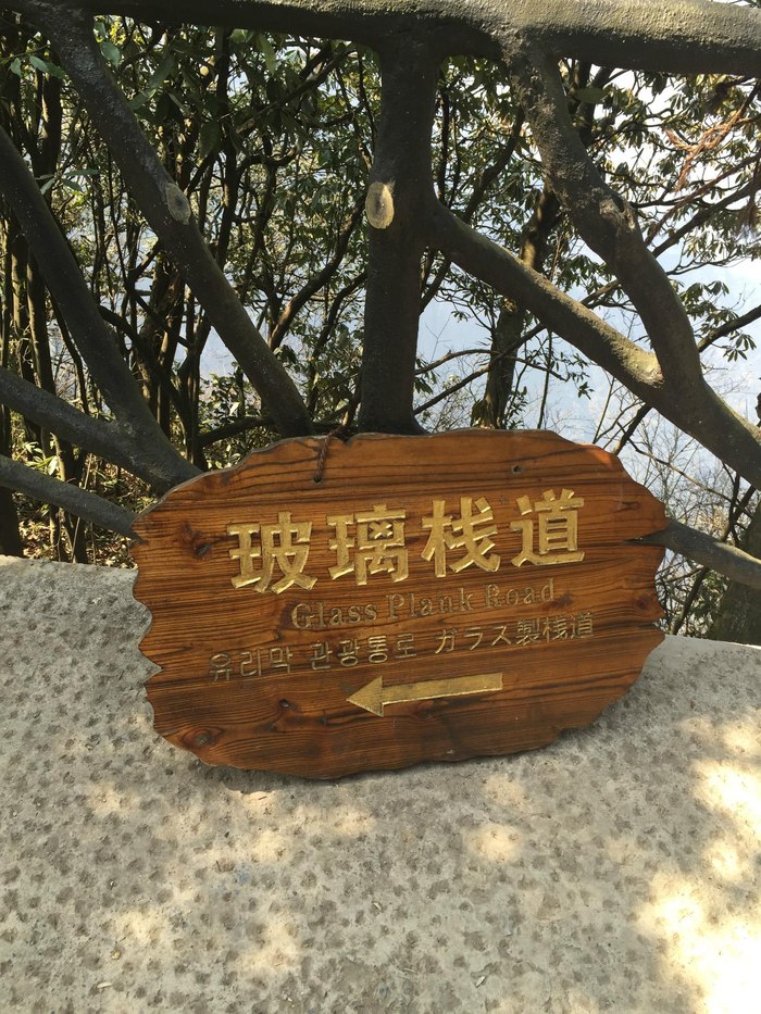 天门山没有路,所有的路都是栈道,在石壁上悬着,让人不寒而栗,孩子和老公都已经打退堂鼓了,我心里也开始有点忐忑。看见了玻璃栈道的牌子让人,十分向往。到处是韩语的标志看来,来的外国友人不少啊!