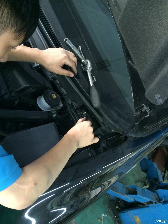 拆前避震筒中,在此赞一下这个小师傅,虽然年轻,但手脚非常娴熟,又认真。