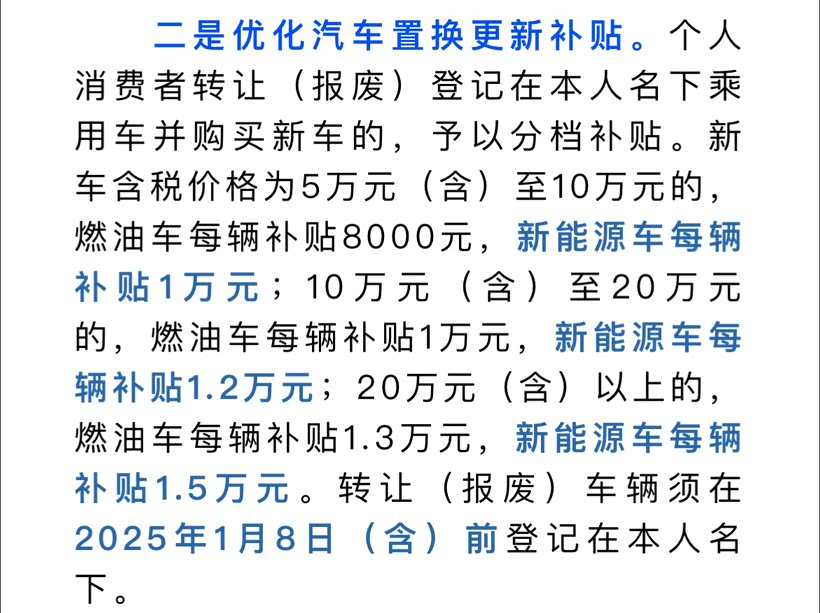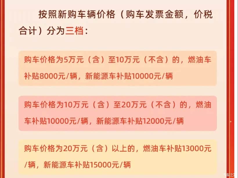 然后旧车置换相继都出台了,旧车置换后买新能源最高补贴1.5万,置换后买油车(2.0L及以下),最高可以获得1.3万的补贴,这个政策大多数省份都有的,(有的是按新车价格范围补贴,有的是价格返点补贴。)也是有个前提同一人。