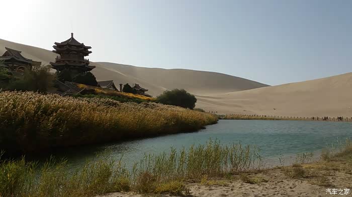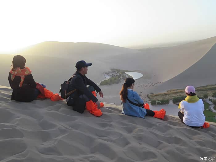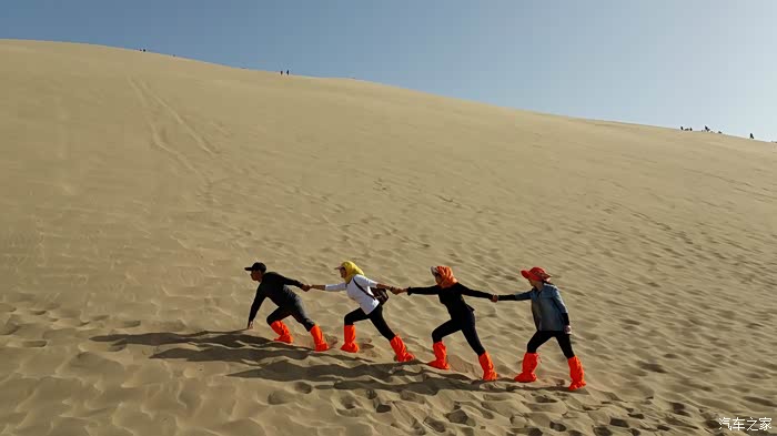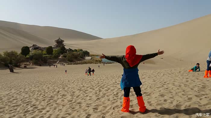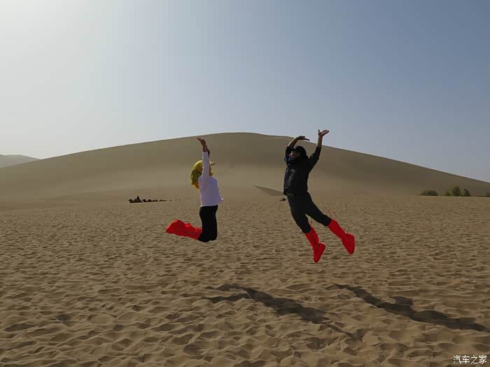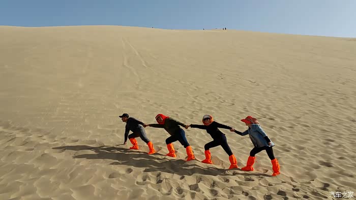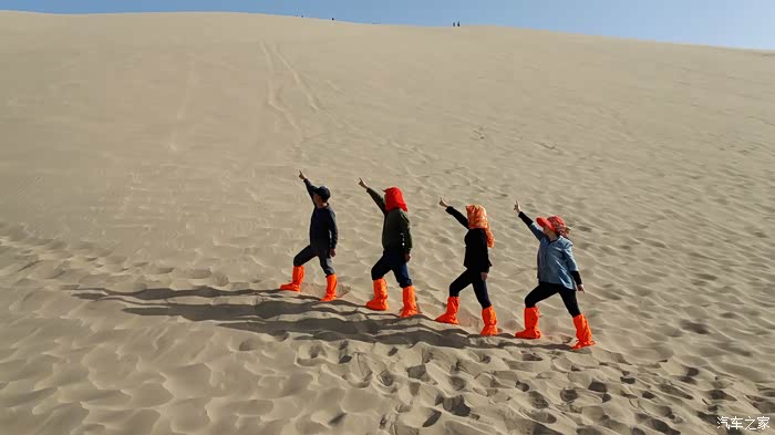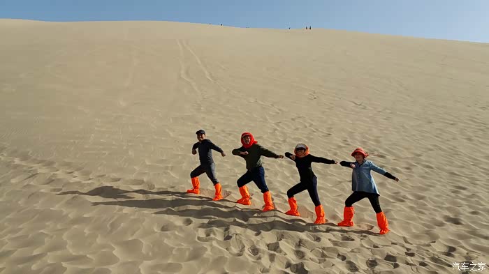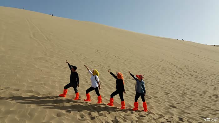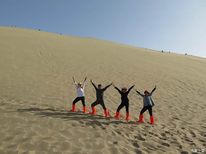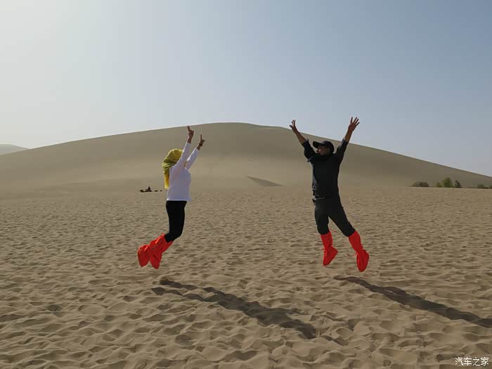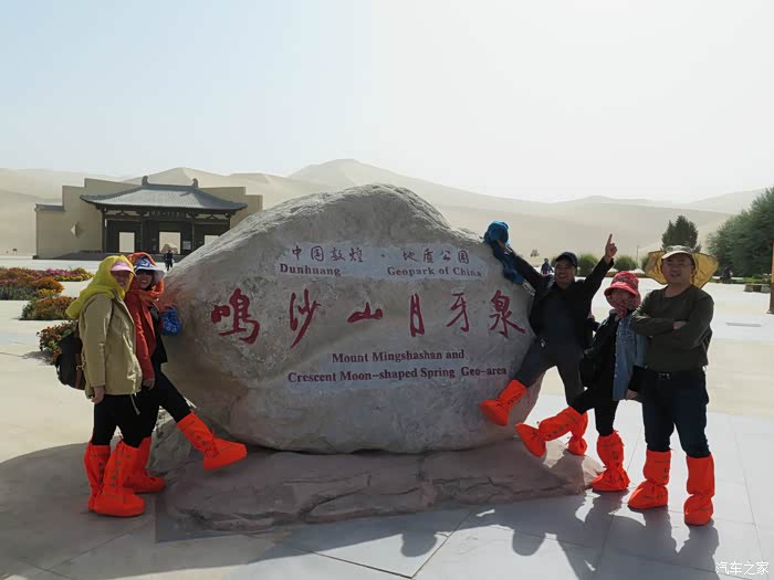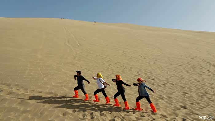 西域的美丽。14点多钟,我们来到鸣沙山月牙泉,套上护沙套,开始游玩,橙红的鞋套在沙漠中