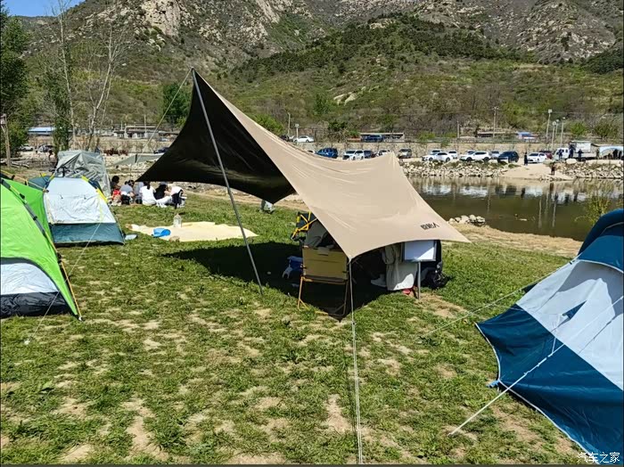 刚到营地的时候,由于下午河边玩的有点晚了,到达搭帐篷的地方已经天黑了我们的帐篷还没有弄好而且第一次搭帐篷有点弄不好,旁边露营的大哥看我们两个弄了半天过来教我们怎么弄的,还告诉我们怎么打地钉更加牢靠。因为帮忙认识了旁边几组陌生人,晚上也没啥事一起分享零食互相聊天也是挺舒服的状态。