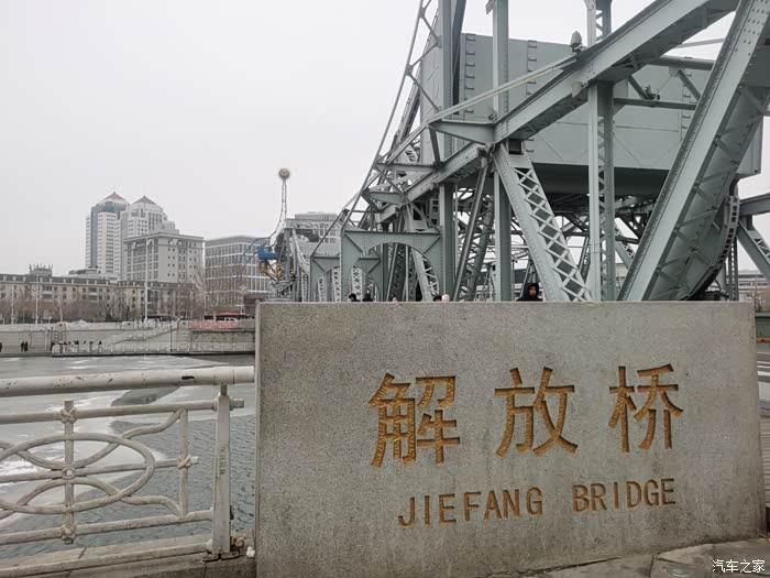 冬天的北方还是很冷的。我们来天津这几天,看到河面确实有不少地方都是冻着的。提了车子,我们开车到了桥这边。
