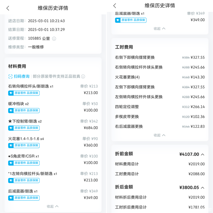 这次维修进行的项目有:更换前面两个转向球头杆、前面两个下摆臂、更换发电机皮带、更换右后减震器、更换火花塞、四轮定位,材料加工时费用总计花了3800元,当时真的很内疼。