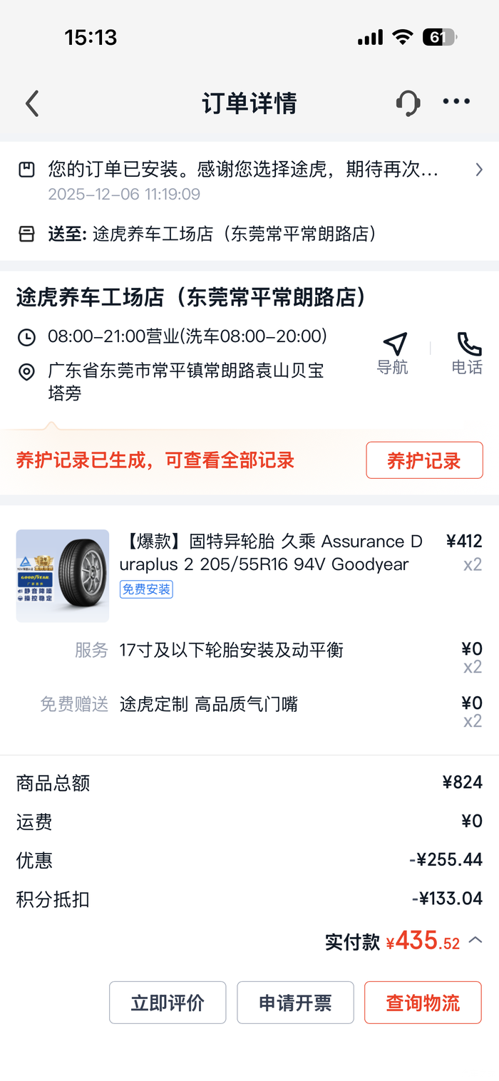购买了两条新轮胎换到了前轮上,花费了435.52元。