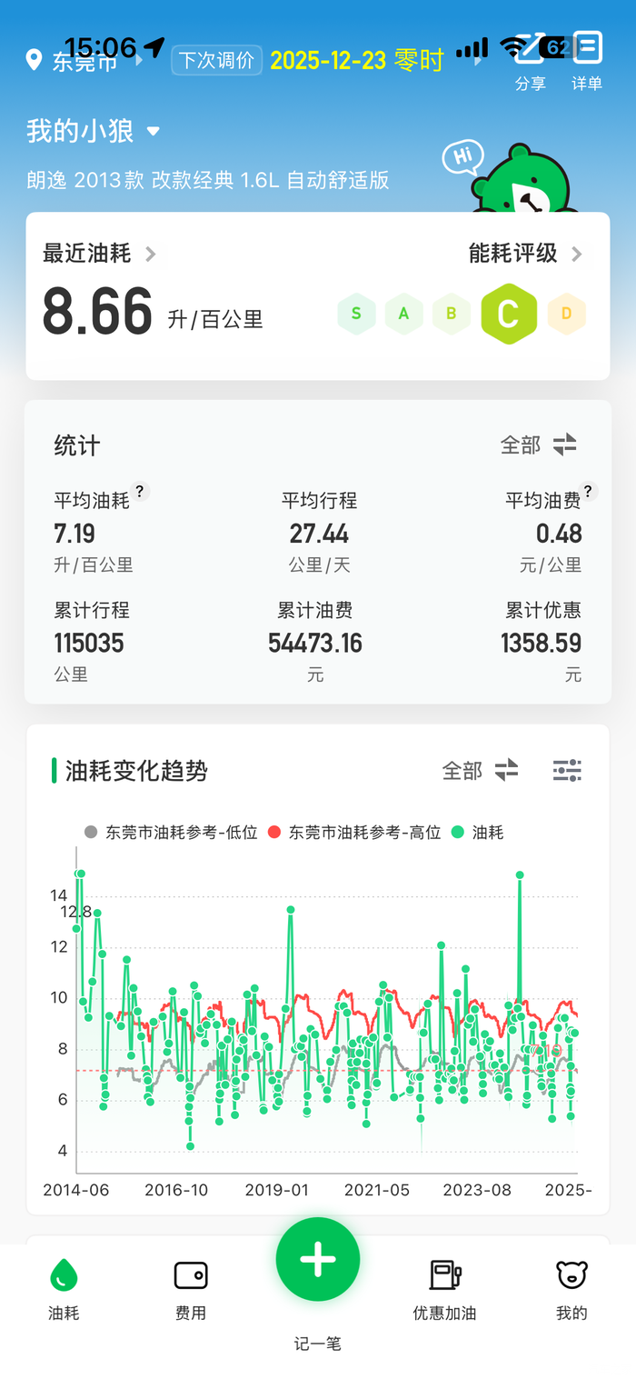 从买车开始,我就有安装了这个油耗记录软件,一直有保持记录的习惯,每次加完油之后,我都会记录到这个软件中。不看不知道,一看吓一跳,这辆朗逸11万5000多公里,已经产生了54473元的油费。