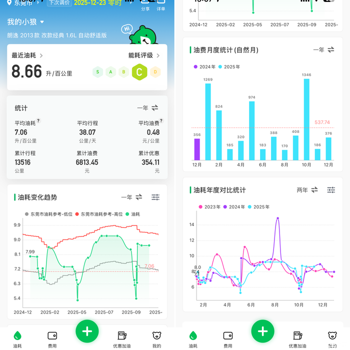 从我的记录中,看到,最近一年时间,行驶了13516公里,累计加油费用:6813.45元,平均约0.48元/公里。