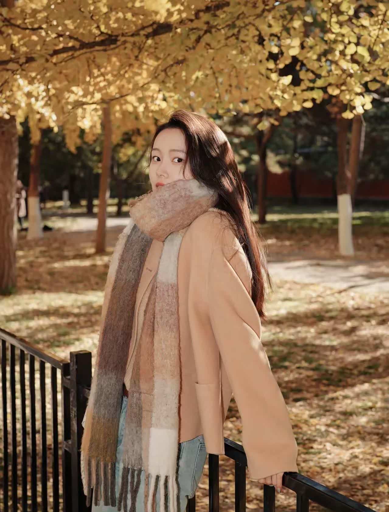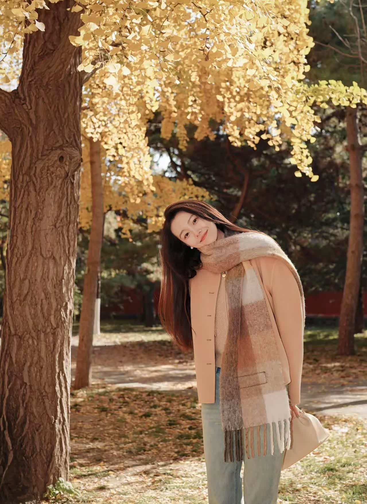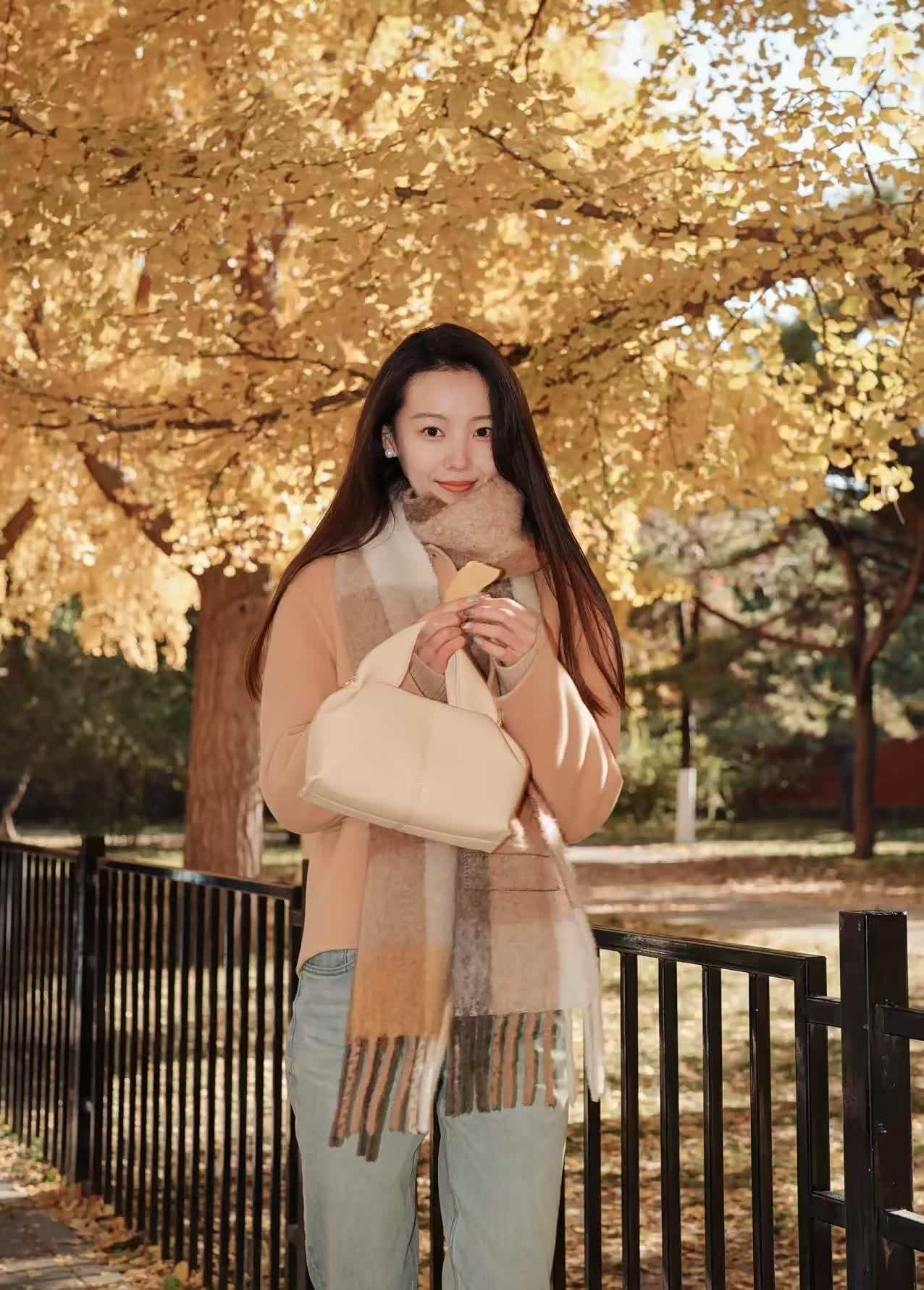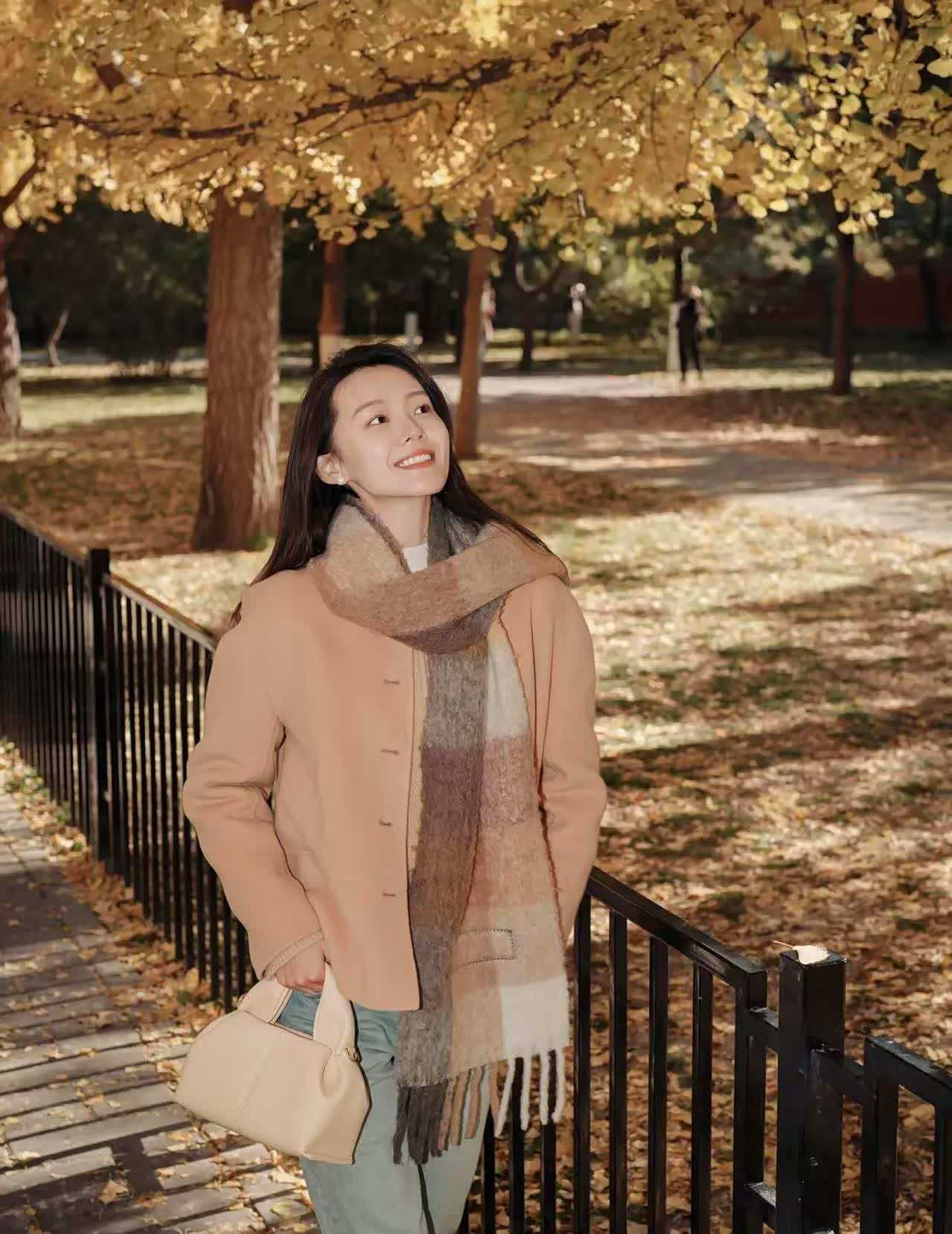 当暮色初降,奥森的秋又添了几分朦胧的诗意。女孩将格纹围巾裹紧些,半掩着面庞,笑意从眼角眉梢溢出。她手中的米色包包与这暖棕的秋景呼应,每一处细节都透着对秋天的偏爱。远处的树影在夕阳下被拉得很长,地上的落叶也被染上了橘红的光晕,整个奥森仿佛成了一座金色的城堡,而她,便是这城堡里享受秋之馈赠的公主。