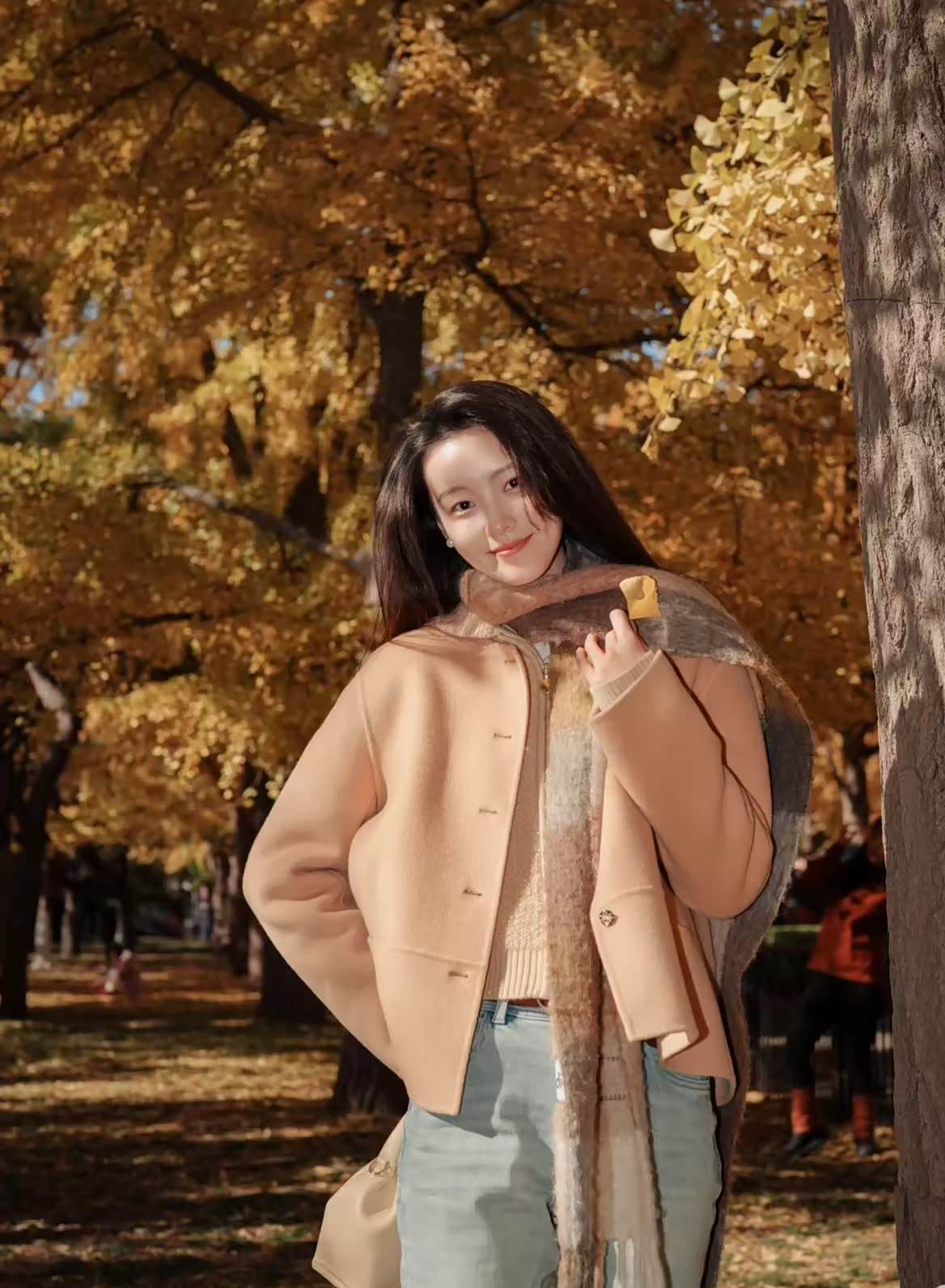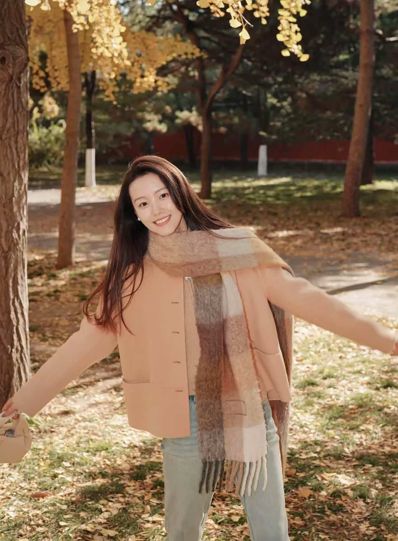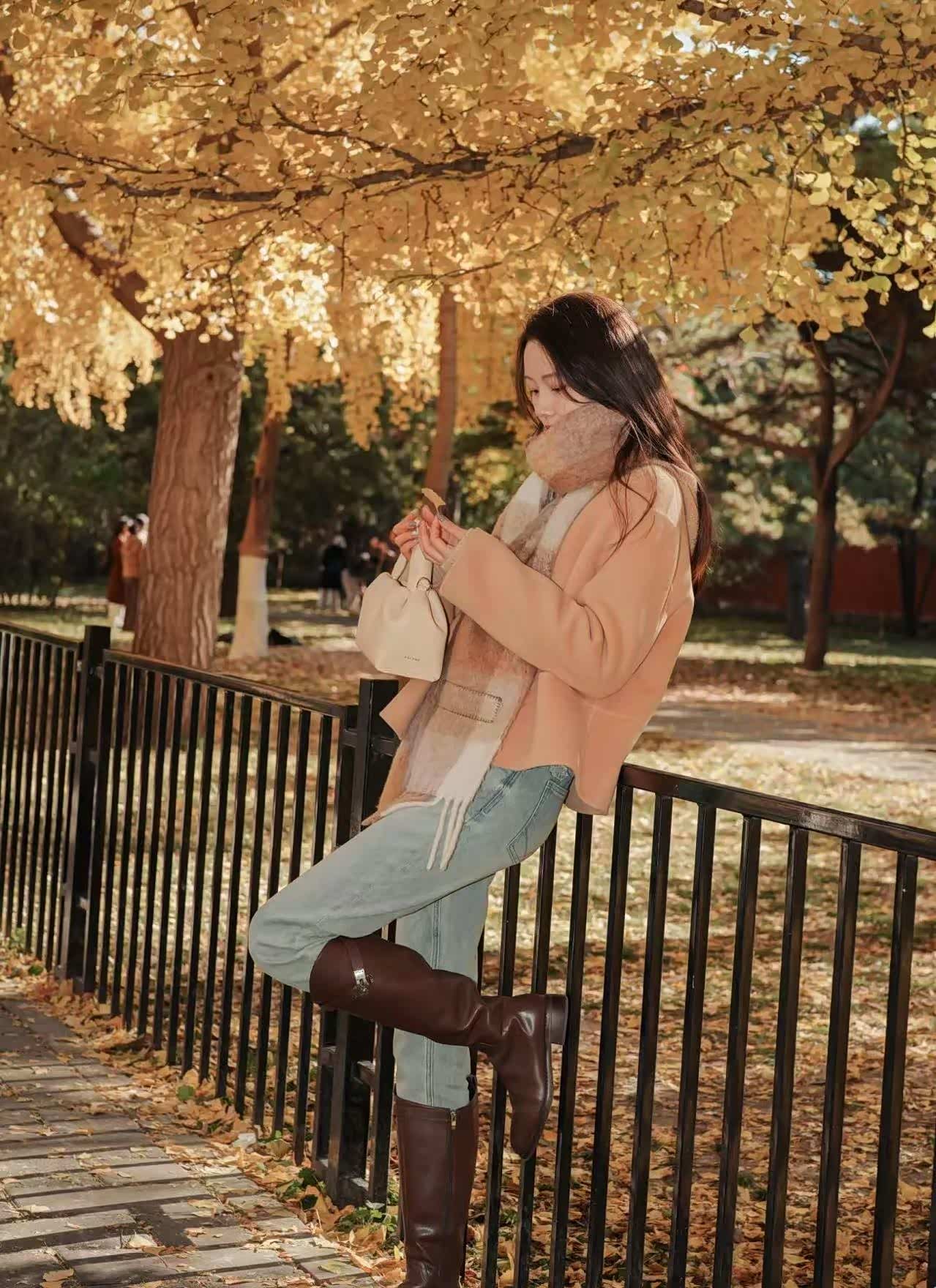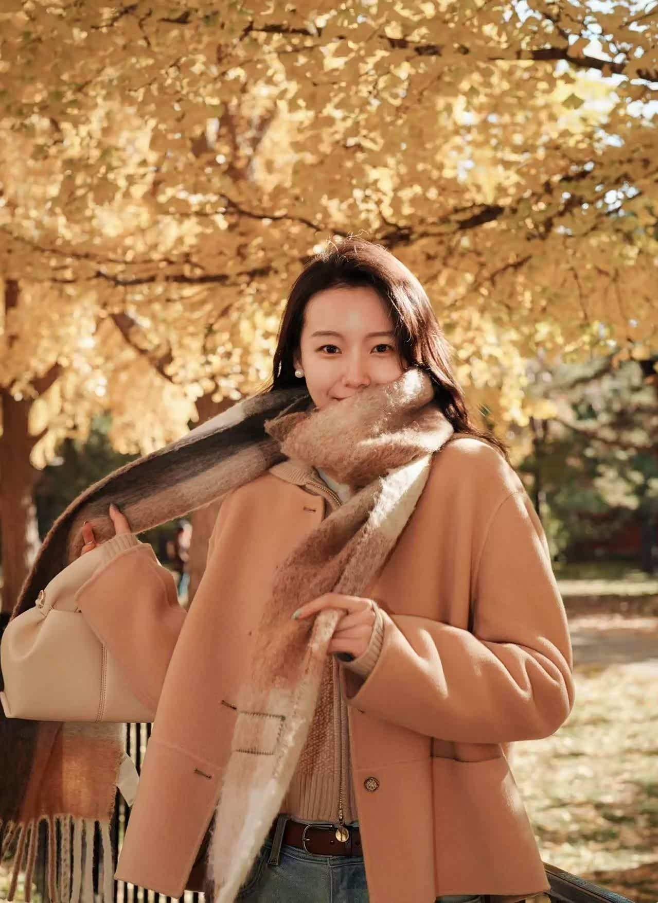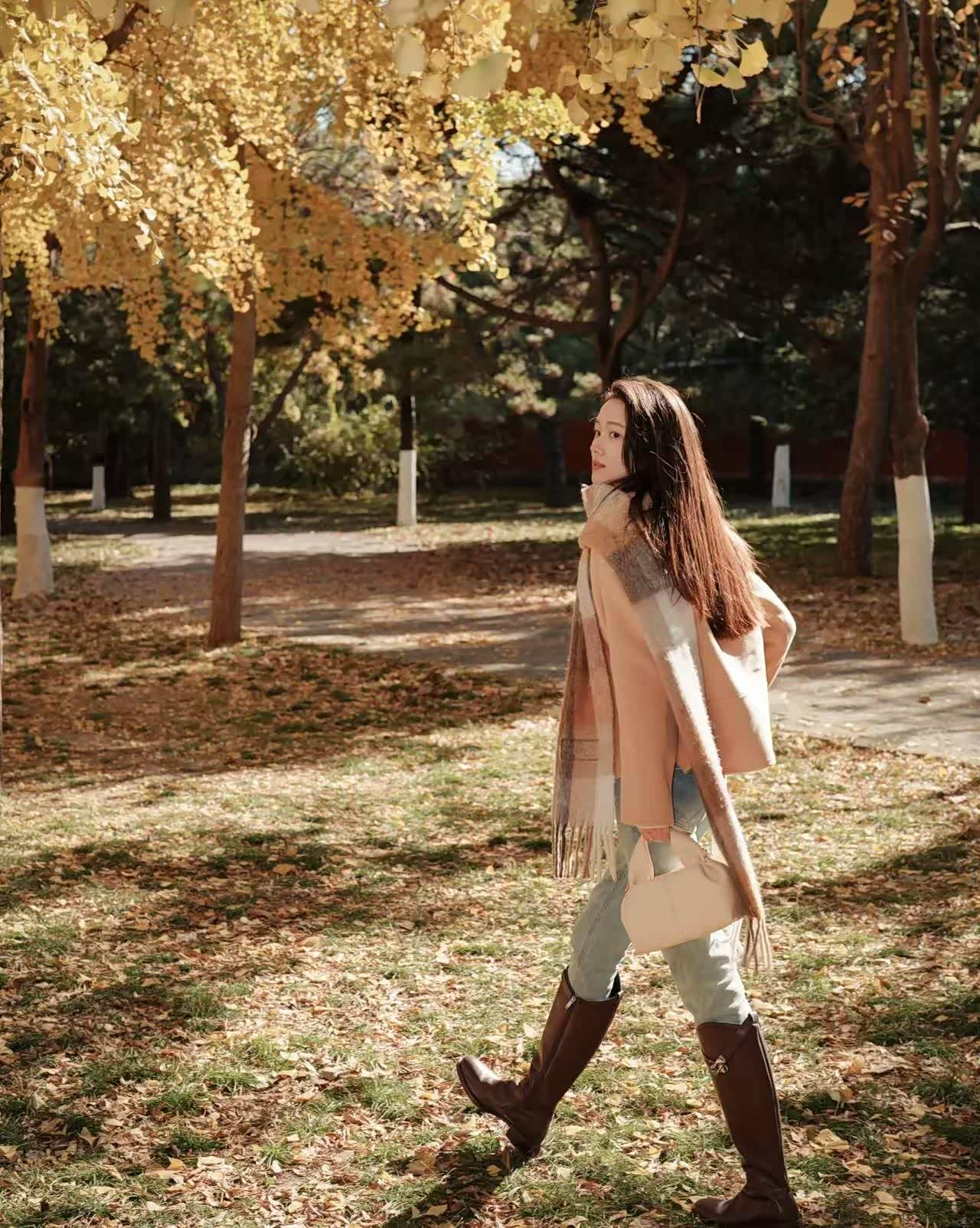 当暮色初降,奥森的秋又添了几分朦胧的诗意。女孩将格纹围巾裹紧些,半掩着面庞,笑意从眼角眉梢溢出。她手中的米色包包与这暖棕的秋景呼应,每一处细节都透着对秋天的偏爱。远处的树影在夕阳下被拉得很长,地上的落叶也被染上了橘红的光晕,整个奥森仿佛成了一座金色的城堡,而她,便是这城堡里享受秋之馈赠的公主。
