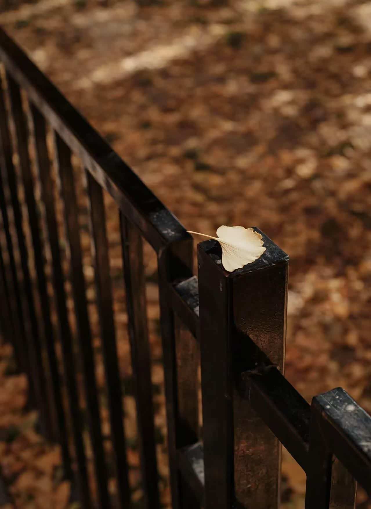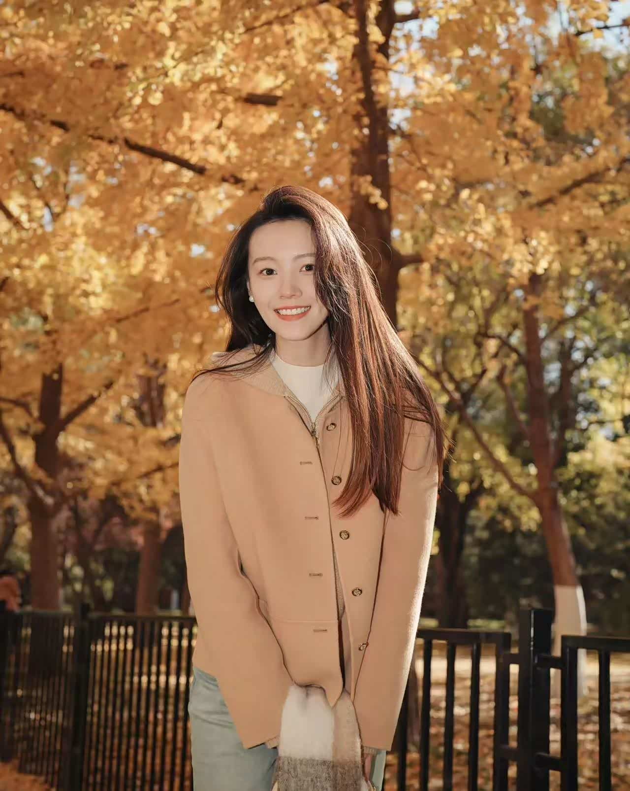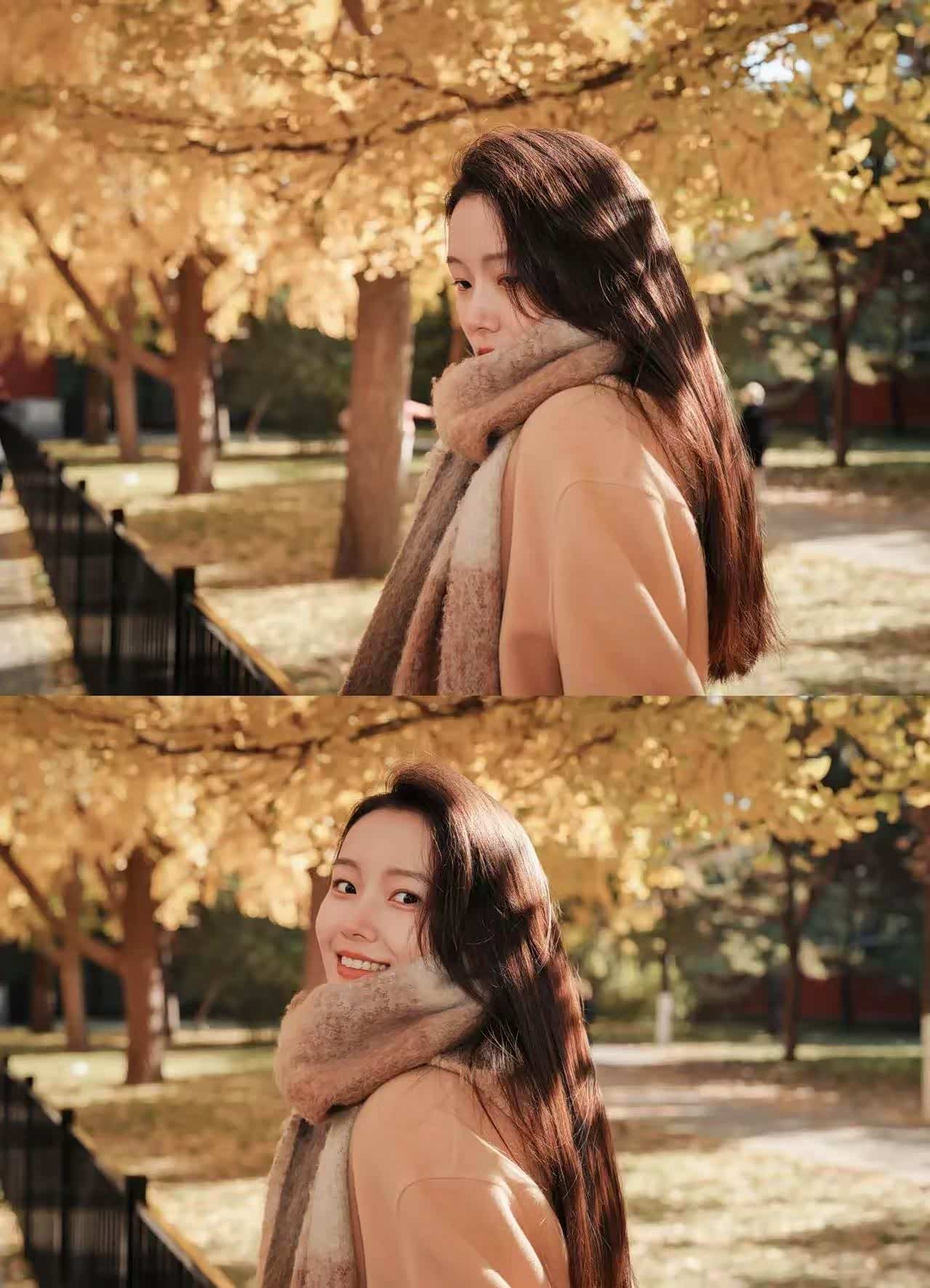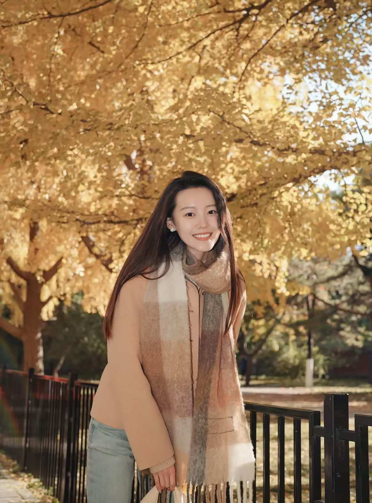 阳光热烈而不灼人,把银杏叶镀上了一层金边。女孩倚着树干,或是站在黑色围栏旁,仰头望向上方的枝叶,眼神里满是对秋的沉醉。