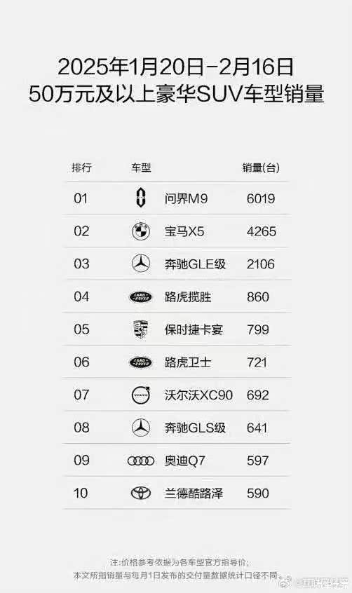根据50万元及以上豪华SUV的销量榜单看,问界M9依旧延续冠军优势,但是领先第二名宝马X5的优势已经被缩小。