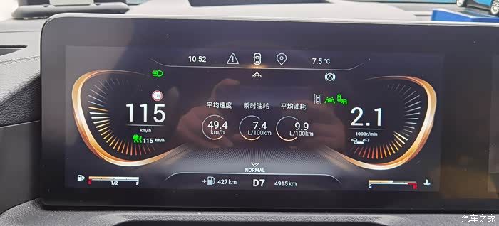 测试油耗还是老方法,21日出发前加满油至跳枪,加进92号汽油28.26升(7.43元/L,210元),表显4888KM,7公里快速路进入高速,驾驶过程是按本人平常较为激进的个人驾驶习惯,高速基本顶着限速(110、120KM/H)在跑,超车最高速度150码,全程空调暖气,下雨天胎噪较大。 大部分路段启动全速自适应巡航,至武汉凤凰山下高速。23日返回,加满油至跳枪,加进92号汽油41.12升(7.43元/L,305.52元),车辆显示里程5332KM。