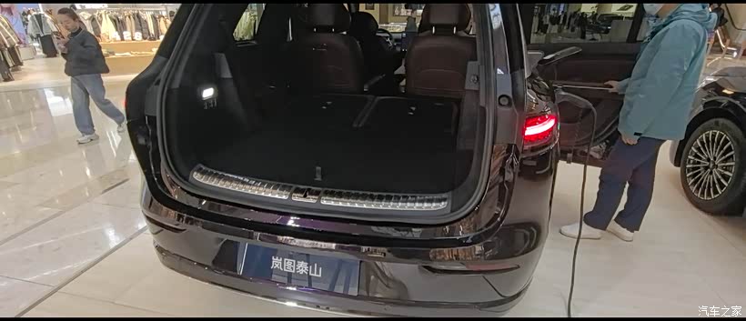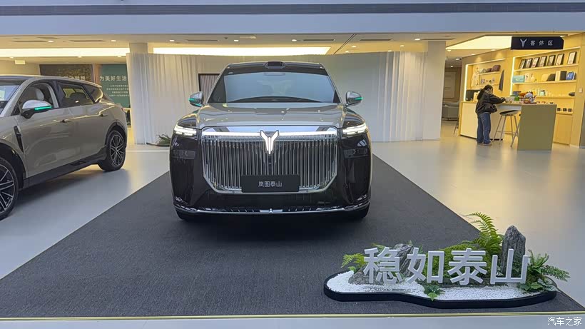 刚进店就被门口那辆深灰岚图泰山勾住——车头直瀑格栅跟泰山石敢当似的稳,车牌明明白白写着“岚图泰山”,车前还摆着“稳如泰山”的石头绿植景观,跟山水画凑一块儿,客休区的“为美好生活”标语都跟着沾光。旁边还有辆浅棕SUV,展厅暖光一打,特舒服。