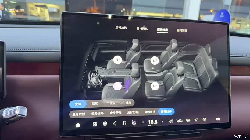 再看座椅按摩,界面跟玩游戏似的,选“腰臀拉伸”模式,六种模式换着来,堵车时按一下,比去按摩店还爽!