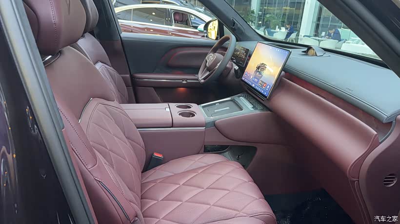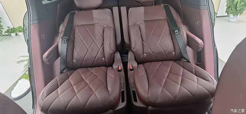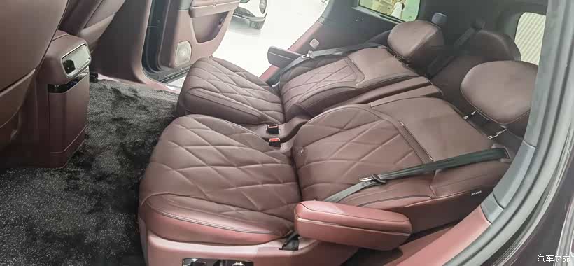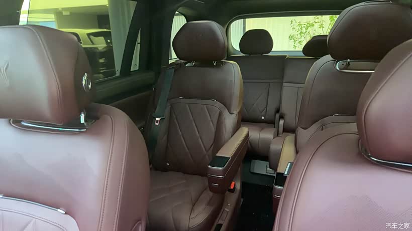 后排更绝——四个深棕色独立航空座椅,菱形缝线和头枕刺绣呼应,带腿托,半躺刷剧时,跟移动私人影院似的。中间还有两个红色按钮,估计是调座椅的,车门内侧跟座椅同色,特协调。