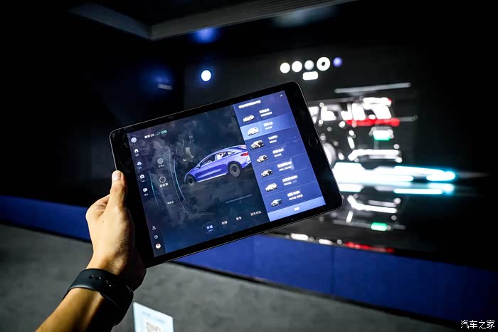 然后在旁边呢,还有个“全息智驾舱”,通过ipad可以选择任何一款您感兴趣的车进行360度的静态品鉴。同时前方的小桌子上还有矿泉水和各种糖果,用户体验感非常棒!
